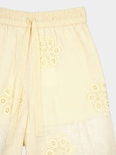 Bask in the lightness of these buttery yellow trousers adorned with delicate embroidery. The drawstring waist and airy linen fabric offer both comfort and style, making these trousers a sunny day favorite for a relaxed yet chic look.