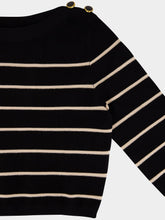 The Black and White Stripe Crush Cropped Top is a chic, versatile piece crafted from soft viscose. Featuring a classic crew neck and a fitted cropped silhouette, this top is adorned with horizontal stripes for a timeless nautical-inspired look. Designed with long sleeves and button detailing on the shoulders, it’s perfect for pairing with high-waisted trousers or skirts for a sophisticated yet casual ensemble.
