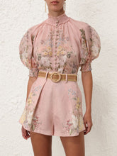 This enchanting floral ramie blouse features a charming placement print throughout, with a shirred neckline and cuffs adding an extra touch of elegance. The short blouson sleeves and rouleau loops with buttons down the center front enhance its romantic appeal. Ideal for spring and summer, this blouse is perfect for elevating any casual or semi-formal look.