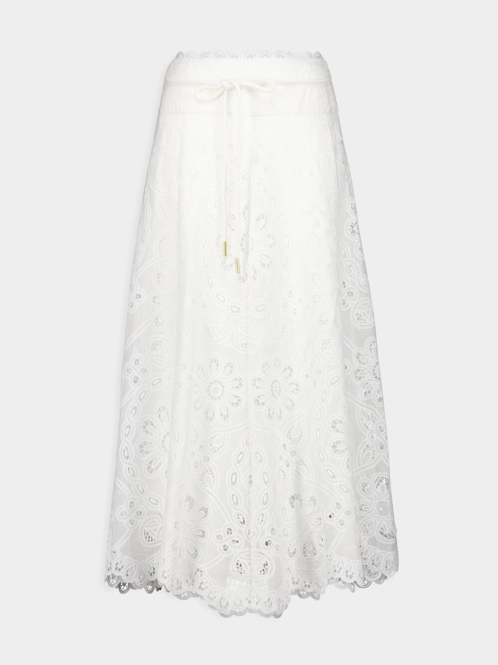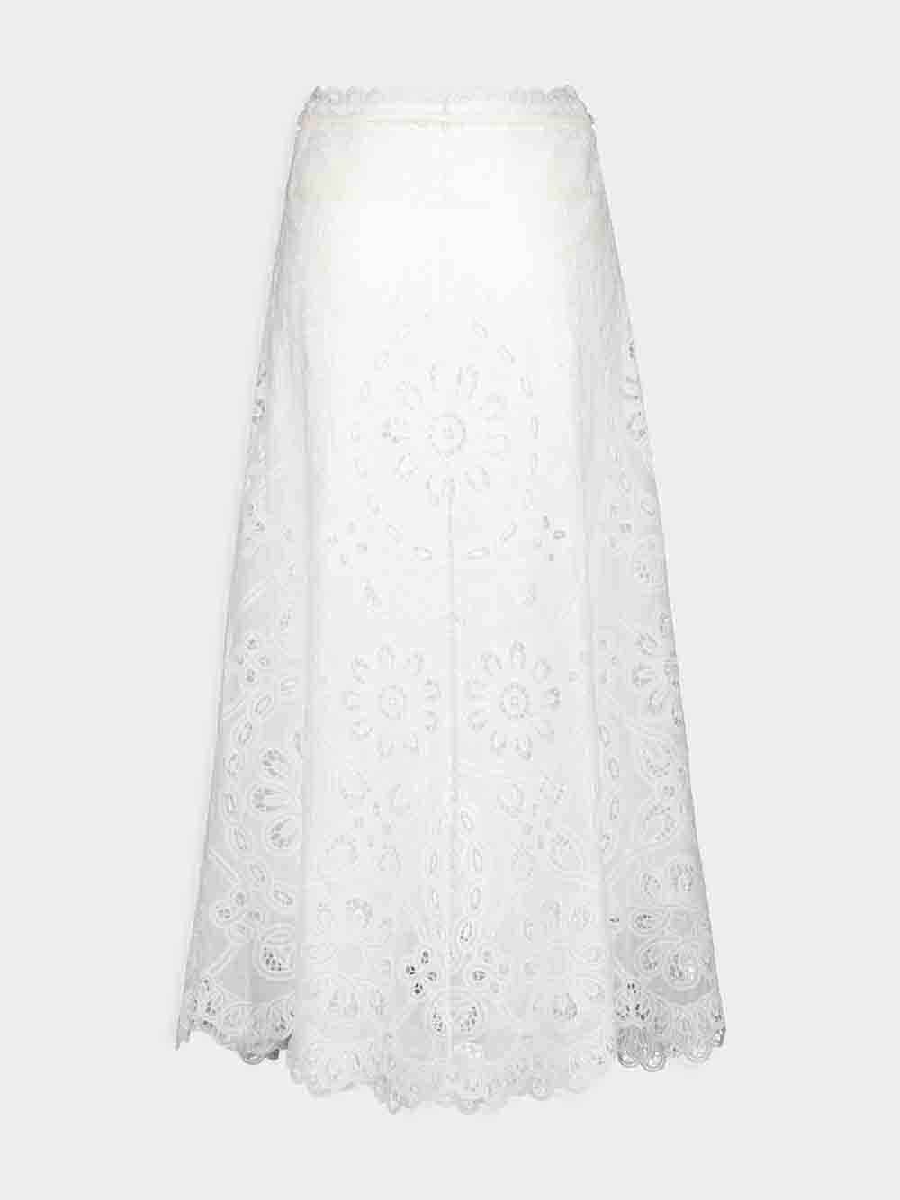 This elegant white cotton midi skirt features a delicate scalloped hem and a removable belt for versatile styling. The invisible zip at the center back ensures a seamless look. Perfect for summer occasions, this skirt is both stylish and comfortable.