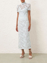 The Mint Lace Pencil Midi Skirt showcases an exquisite lace design. This midi skirt features a lined pencil silhouette, an organza lined hem, and an invisible centre back zip, making it a perfect blend of elegance and sophistication for any wardrobe.