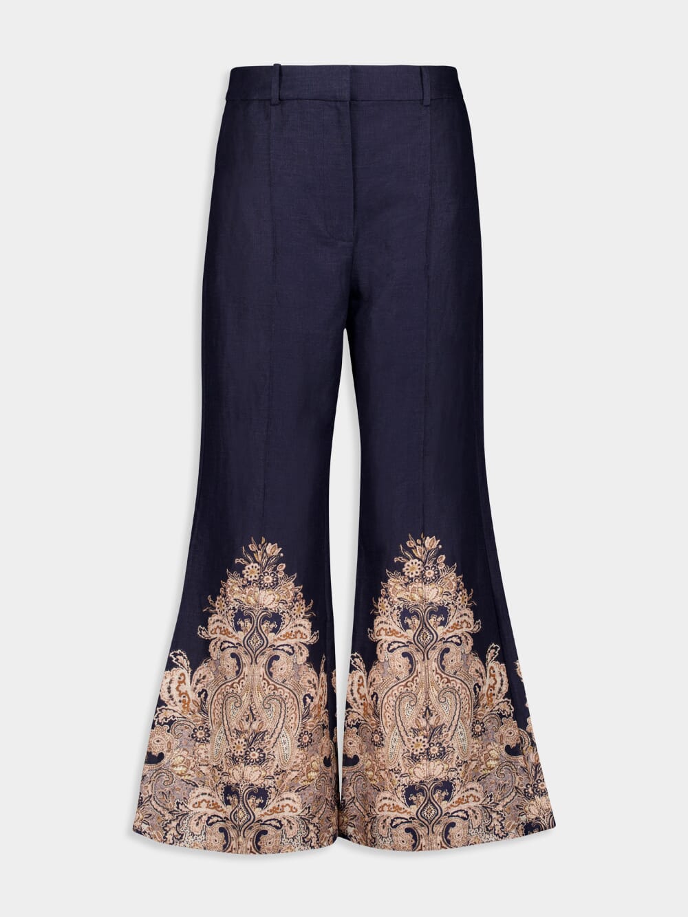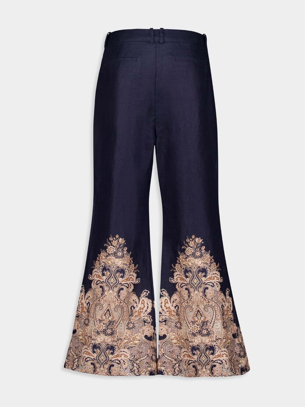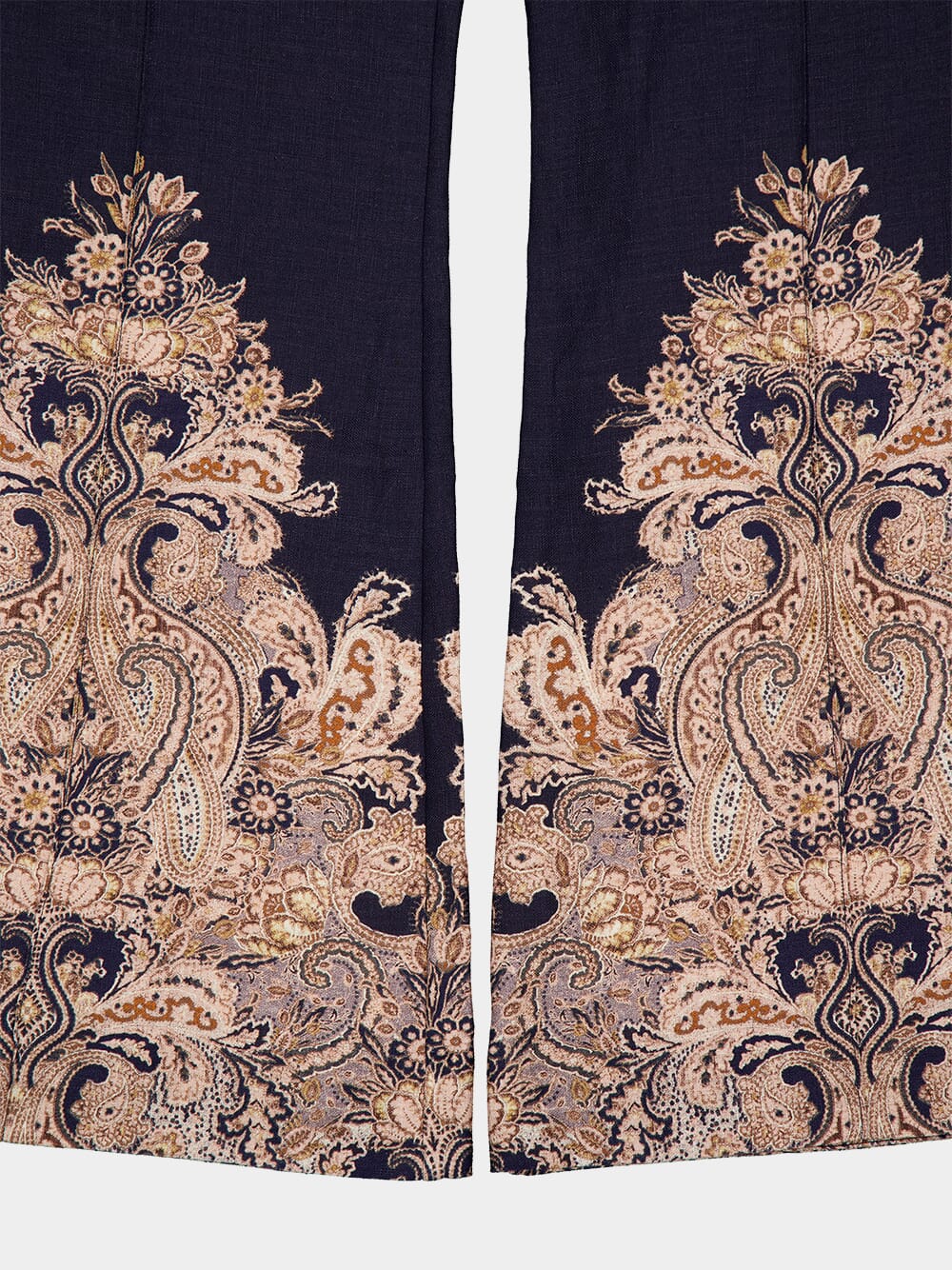 The Navy Paisley Flare Pants feature a striking flared silhouette and intricate paisley design. The front zipper, belt loops, and convenient front pockets enhance both style and functionality. Perfect for adding a touch of sophistication to your wardrobe.