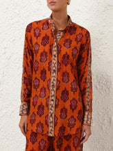 The Wylie Dolman Shirt in Sunset Ikat is a luxurious silk piece that combines a relaxed silhouette with striking patterns. Featuring long dolman sleeves, a stand collar, and button closures along the front and cuffs, this shirt exudes elegance and comfort. The contrast stripe details along the sleeves and front placket add a refined touch, while tucks on the sleeves and a box pleat at the back provide added dimension. Perfect for warm evenings, this statement piece is both bold and sophisticated.