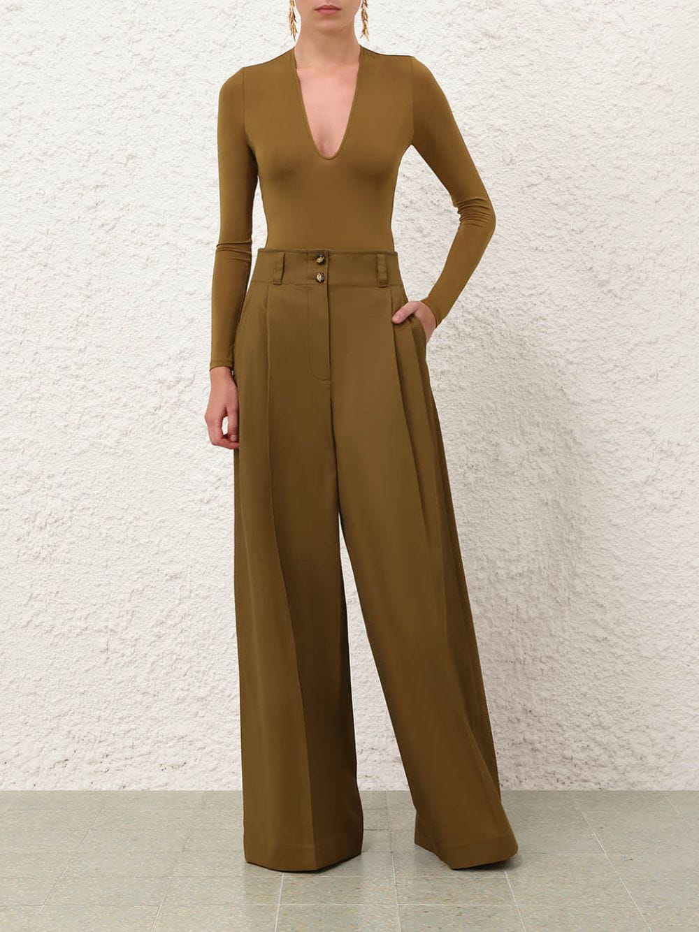 The Luna Drill Cargo Jacket in dark khaki, from Zimmermann’s Spring 2026 Kindred Spirit collection, offers a structured yet refined silhouette in cotton drill. Featuring peak lapels, flap chest pockets, gold-toned branded buttons, and topstitch detailing throughout, this fully lined jacket is finished with bar tabs at the sleeves and relaxed cuffs. A sophisticated take on utilitarian style.