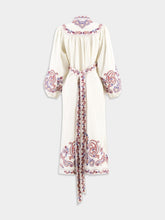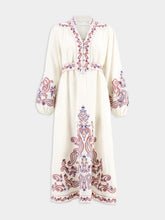 ZIMMERMANN Devi Embroidered Midi Dress, a stunning white linen dress that showcases intricate ornamental embroideries in contrasting red and purple tones. The dress features a flattering V-neckline, elegant balloon sleeves, and a self-tie belt that cinches the waist beautifully. With a flared skirt, this midi dress offers a graceful and feminine silhouette.