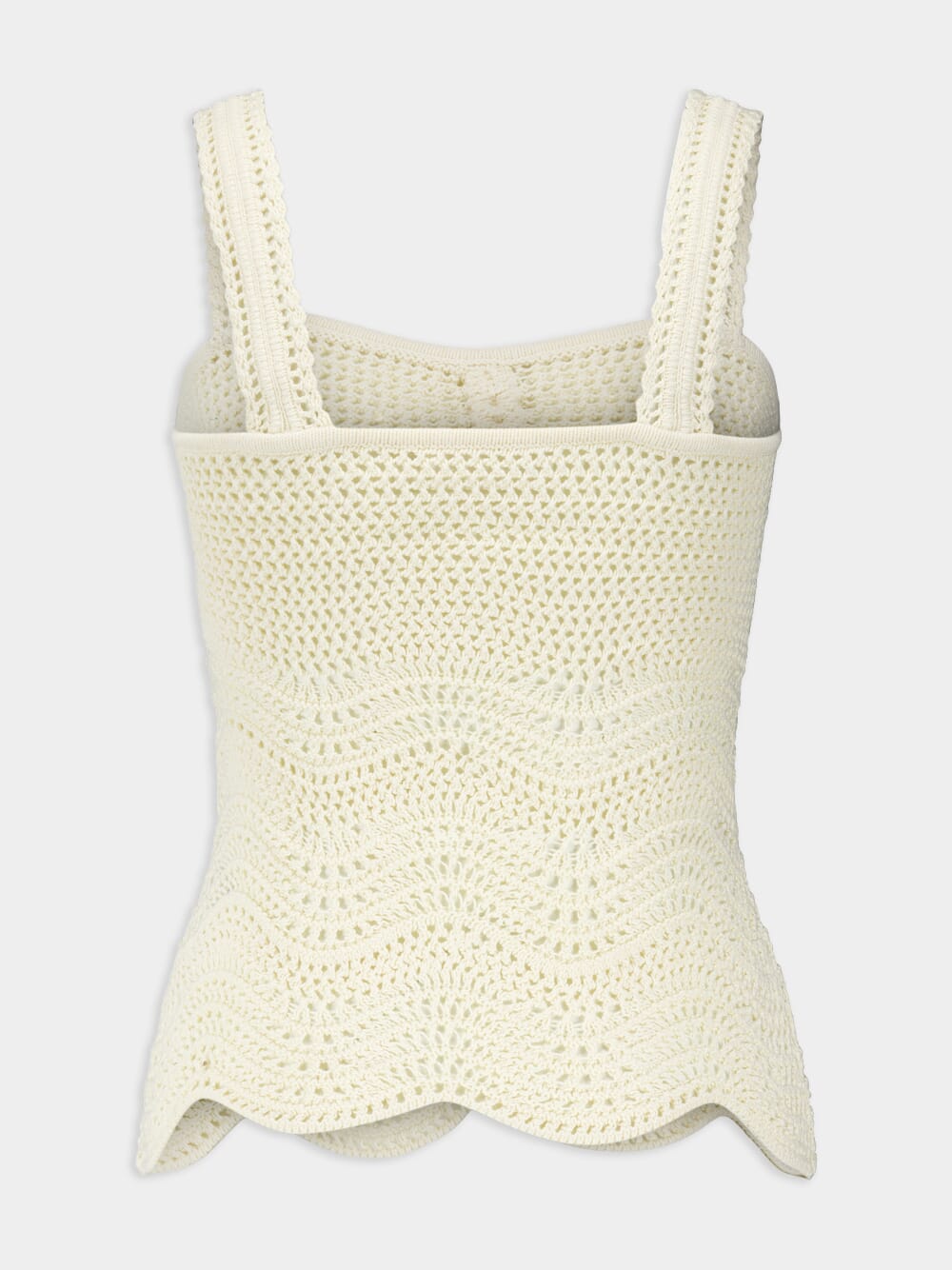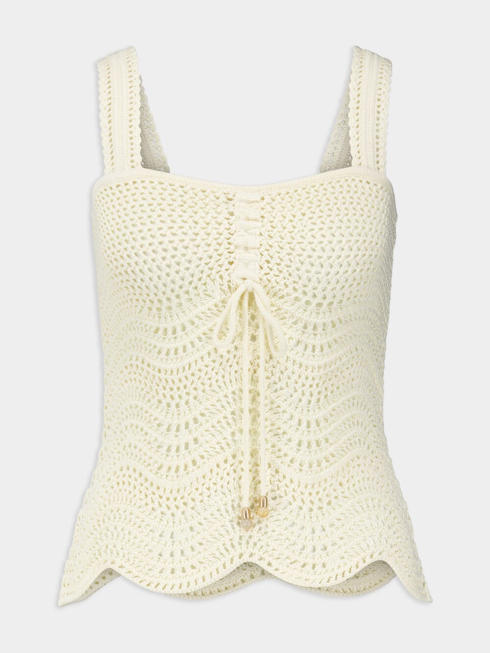 ZIMMERMANN Devi Textured Knit Top crafted in a beautiful cream white hue, this top features a delicate crochet knit design, adding an elegant touch to your ensemble. Made from high-quality cotton, it offers a soft and breathable feel, perfect for all-day wear. The Devi Textured Knit Top boasts a high waist and an elasticated waistband, ensuring a comfortable and flattering fit.