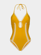 Keyhole Crochet One-Piece, featuring a stretch-design for a comfortable and flattering fit. The one-piece design showcases intricate crochet paneling, complemented by a halterneck tie fastening and alluring keyhole neck. The rear tie fastening and open back add a touch of sophistication.