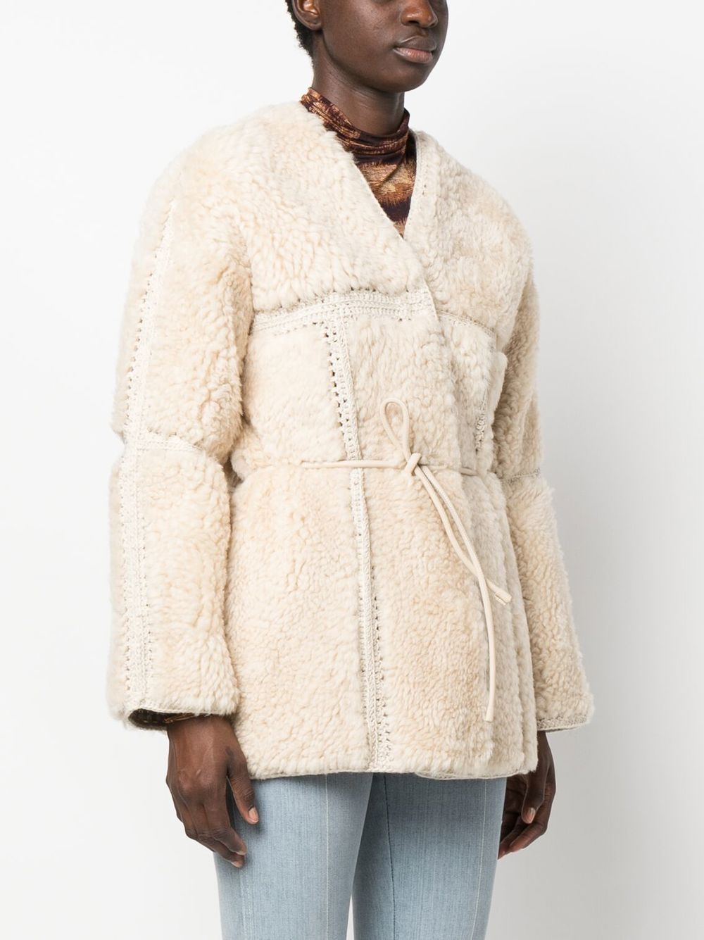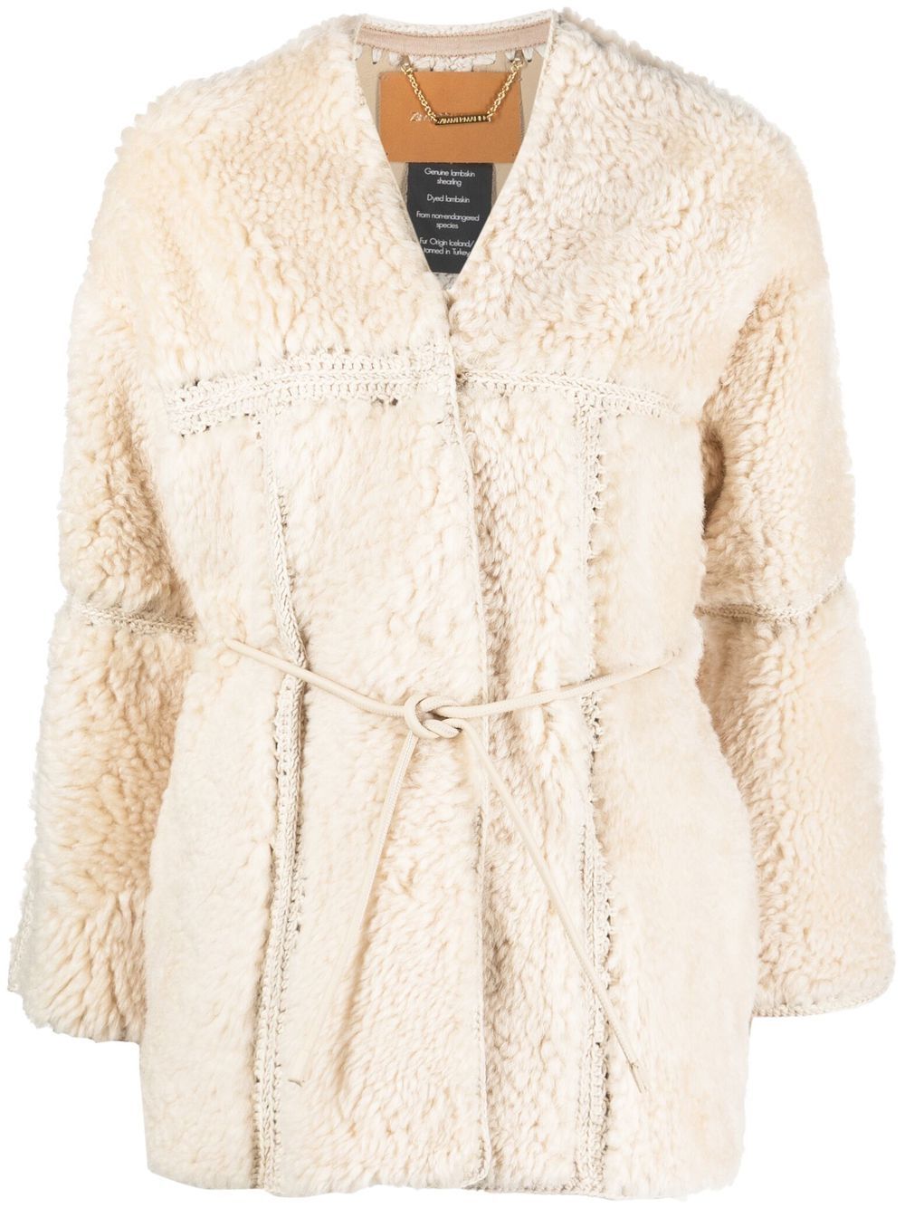 Zimmermann The Kaleidoscope Shearling Jacket in vanilla featuring panels of shearling crocheted together, finished with a leather interior and a removable tubular belt.