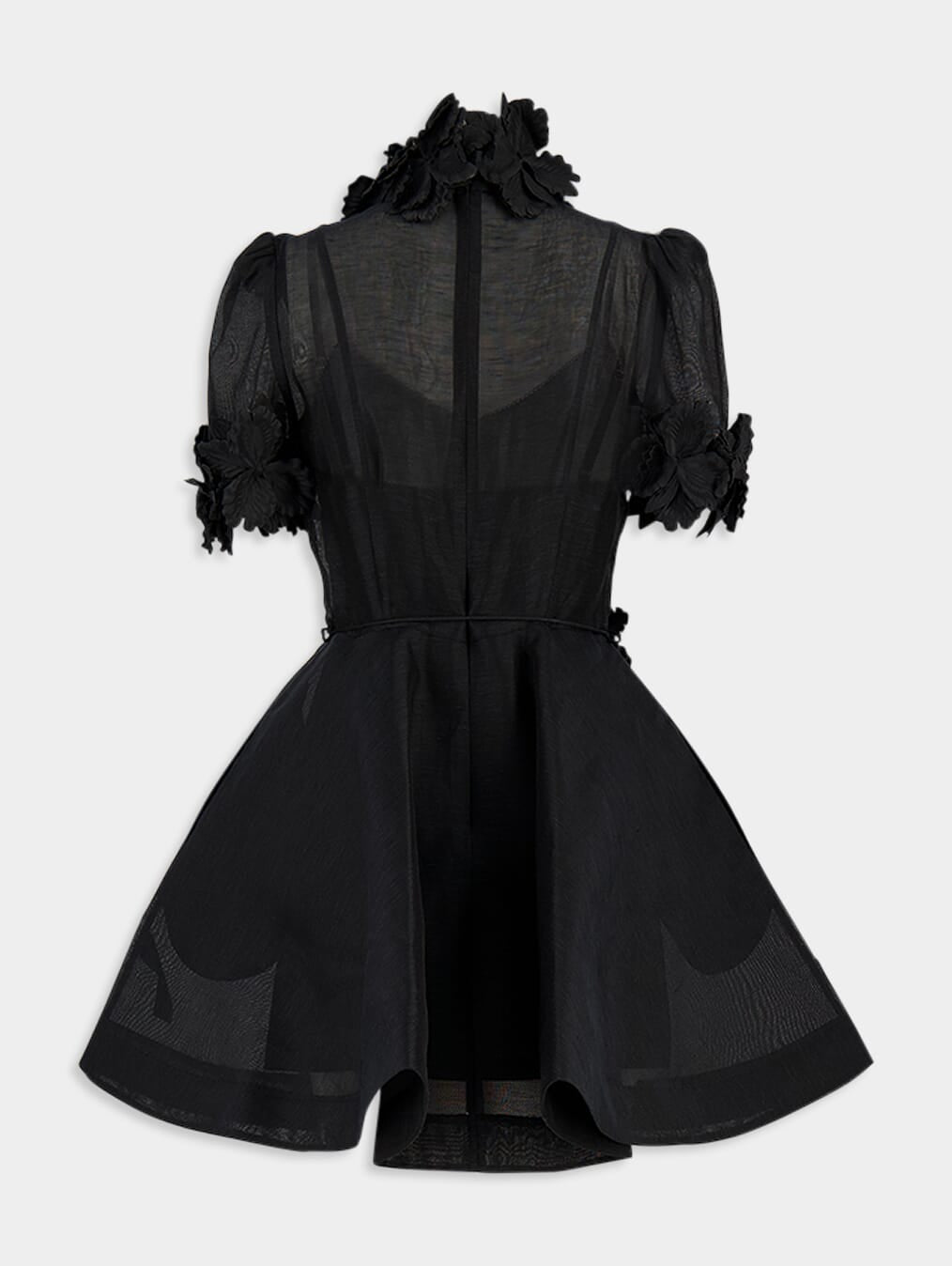 Luminosity Liftoff Floral-Appliqué Minidress, crafted from a luxurious linen-silk blend. Adorned with exquisite floral appliqués, this dress features a high neck and semi-sheer panels for an alluring look. The detachable waist belt cinches your silhouette perfectly, and the concealed rear zip fastening ensures a seamless fit. With short sleeves and a flared skirt, it's a chic choice for any occasion. Additionally, the detachable slip dress provides versatility, and its above-knee length adds a touch of sophistication to your ensemble.