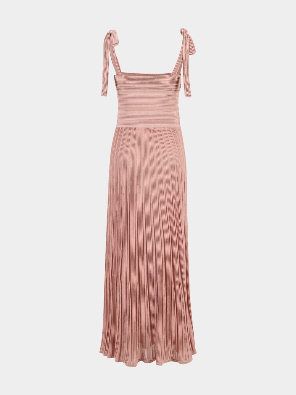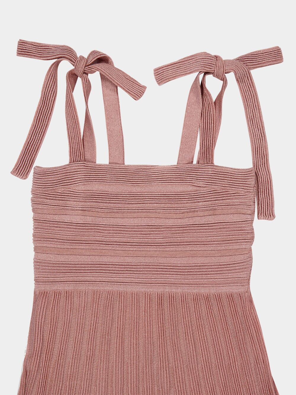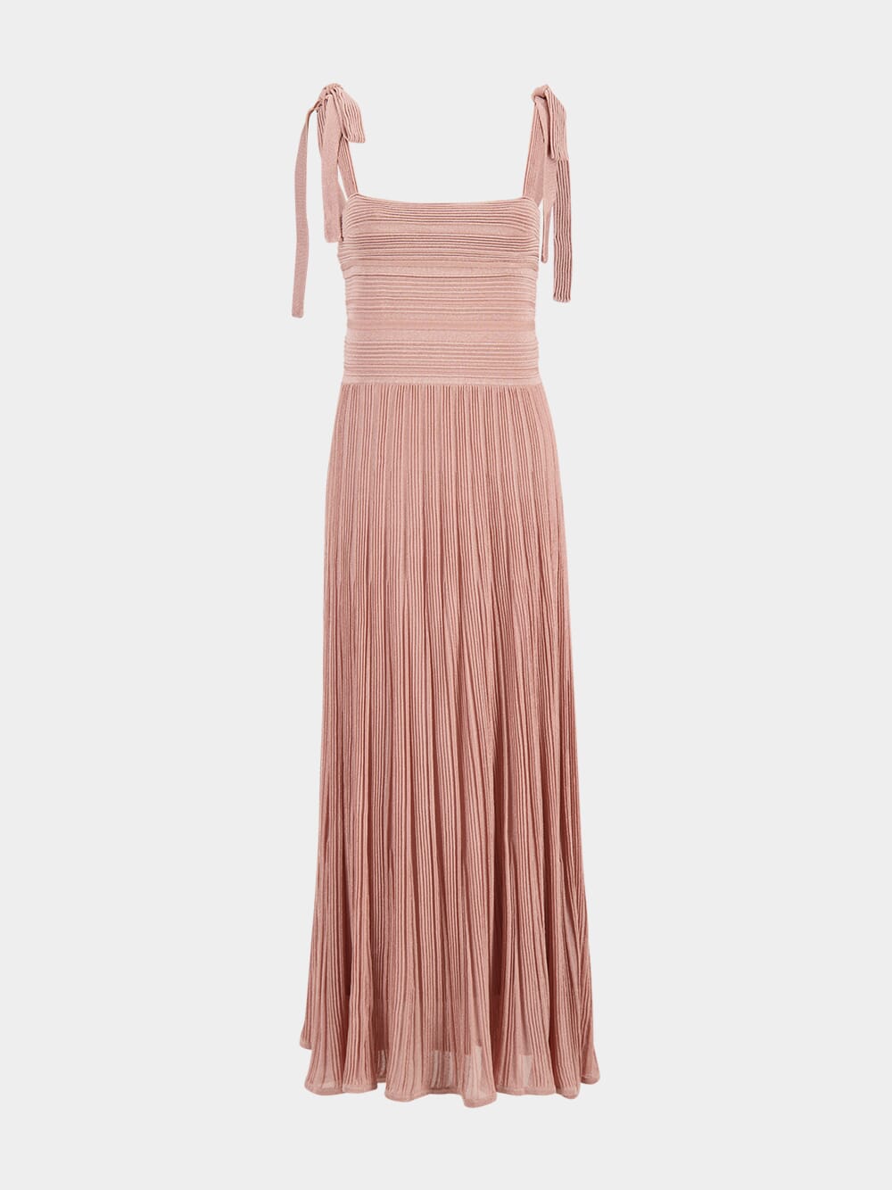 The Metallic Pink Lucky Tie Dress by Zimmermann is a shimmering expression of elegance and ease. Crafted in a soft knit with metallic accents, it features a fitted bust and a slip-on silhouette that enhances natural curves. The shoulder ties add a playful, adjustable detail, while the fluid skirt provides graceful movement. With its rich pink hue and refined sparkle, this dress offers a sophisticated take on relaxed glamour.