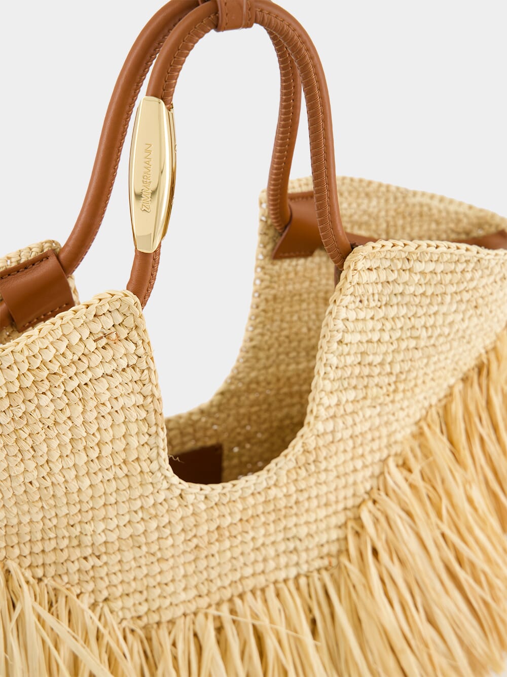 The Goldentime Small Tote by Zimmermann captures the spirit of summer in a compact, artfully handwoven silhouette. Crafted in soft natural raffia, it echoes the organic curves of coastal landscapes, with playful hand-cut fringe detailing and a tubular handle adorned with surfboard-inspired hardware. Unlined and lightweight, this smaller version retains all the charm of the original while offering refined practicality for carrying warm-weather essentials from the beach to the city.
