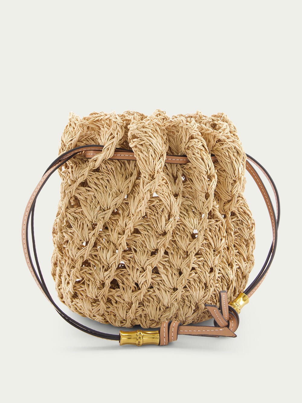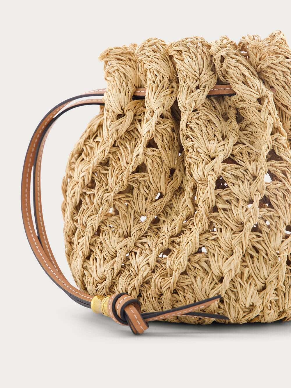 Raffia Drawstring Pouch, a chic and versatile accessory with removable crossbody strap. The removable crossbody strap offers versatility, allowing you to switch between a clutch and a convenient hands-free option. Adorned with gold hardware, this pouch exudes elegance and sophistication.