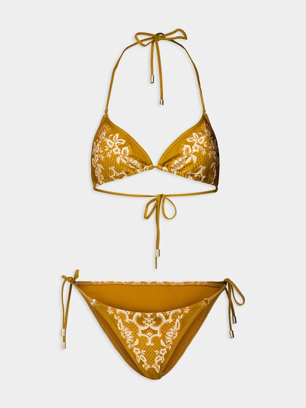 ZIMMERMANN Raie Placement Triangle Bikini: A must-have swimwear set crafted from premium Italian lycra for a comfortable and flattering fit. The triangle bikini top and low-cut pant offer a classic and stylish look. The placement print detail adds a touch of artistry and uniqueness. The self-tie straps with toggle bead ends allow for a customizable fit. Lined for added comfort, this bikini is a perfect choice for those seeking a blend of fashion and functionality.