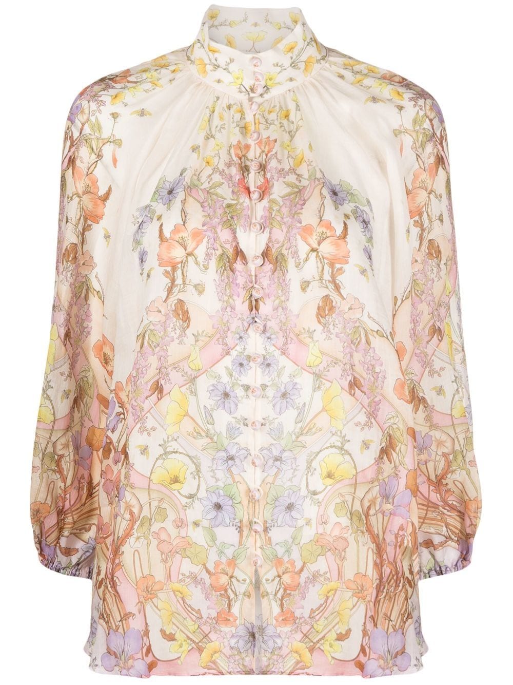 Zimmermann The Jeannie Bracelet Billow in floral swirl ramie blouse featuring a blouson sleeve and self cover buttons.