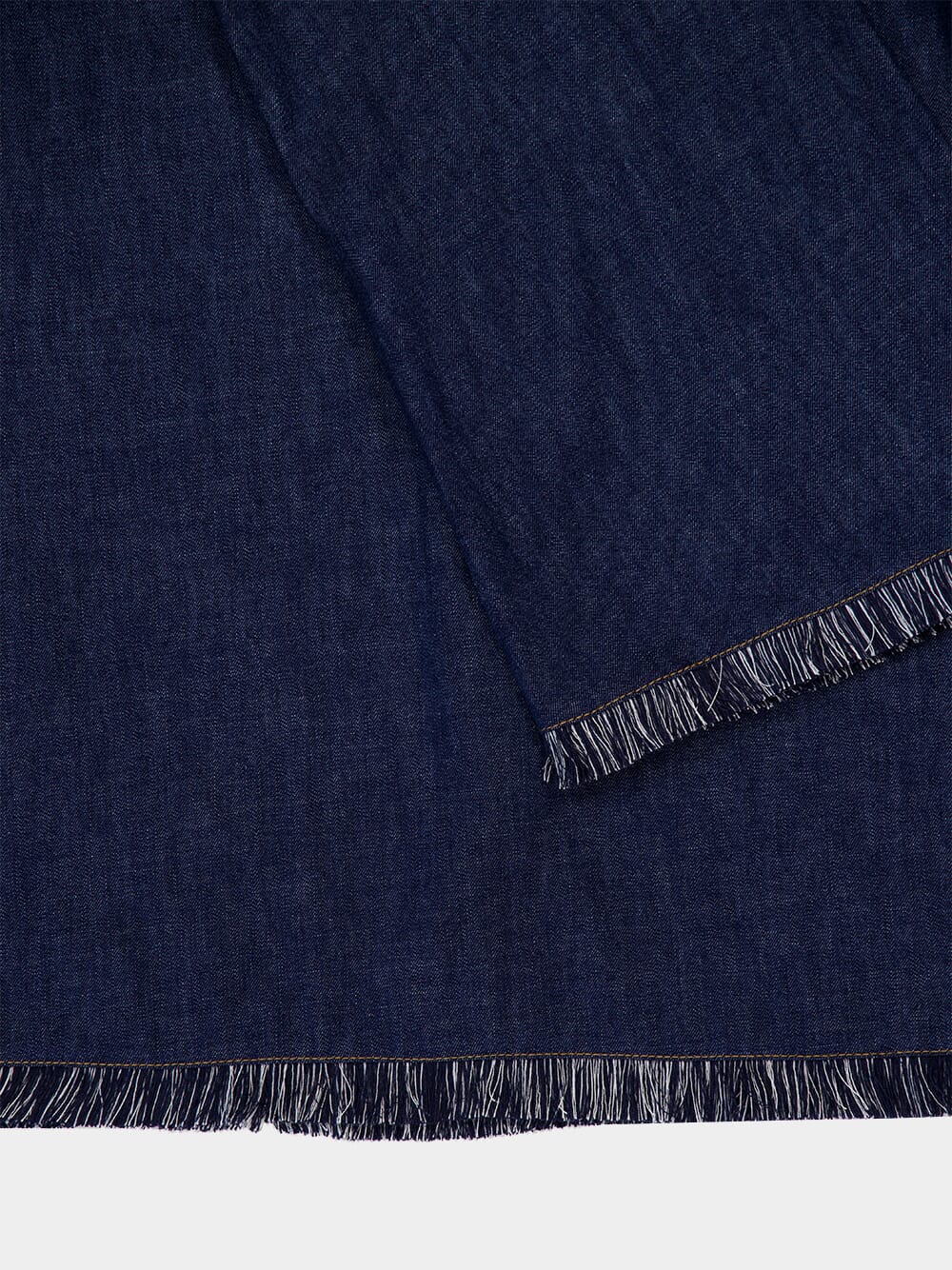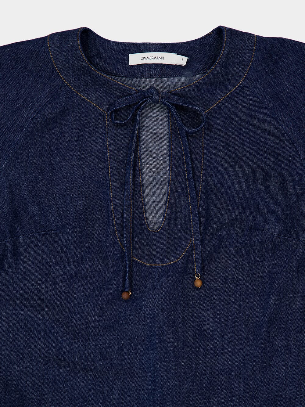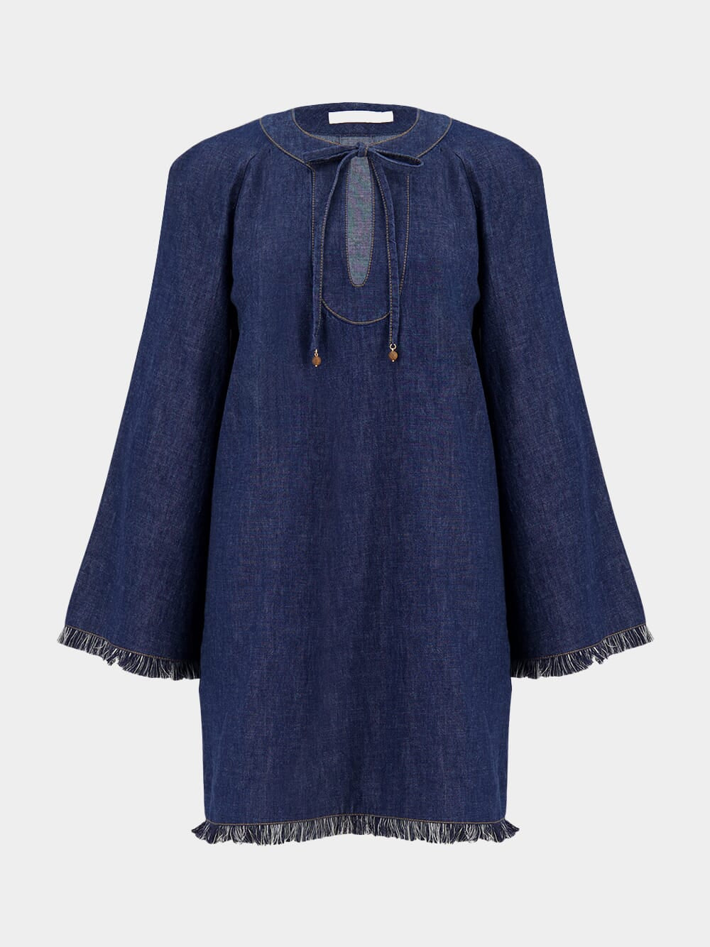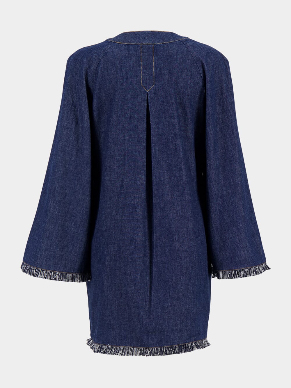 A contemporary take on the classic kaftan, this denim mini dress combines relaxed elegance with distinctive details. Featuring a flattering keyhole neckline with a self-tie rouleau, it’s designed with long, loose-fitting sleeves and playful frayed fringe trims at the cuffs and hem. Functional side pockets add practicality, while the slip-on silhouette ensures effortless wear. Perfect for warm-weather escapes or off-duty days with a touch of bohemian flair.