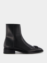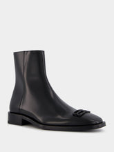 These black calf-length boots are crafted from luxurious calf leather, featuring silver-tone hardware and a sophisticated buckle detail. The sleek design is complemented by double pull-tabs at the opening for easy wear, and a leather lining ensures comfort. With their timeless silhouette, these boots add an elegant touch to both casual and formal outfits, perfect for year-round wear.