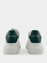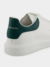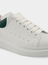 These Alexander McQueen oversized sneakers are crafted in smooth white leather, highlighted by a contrasting phthalo green heel tab. Designed with a clean, minimalist silhouette, they feature perforated sides, tonal laces, and the brand’s signature exaggerated rubber sole. A refined yet modern statement piece that adds a fresh touch to any casual ensemble.
