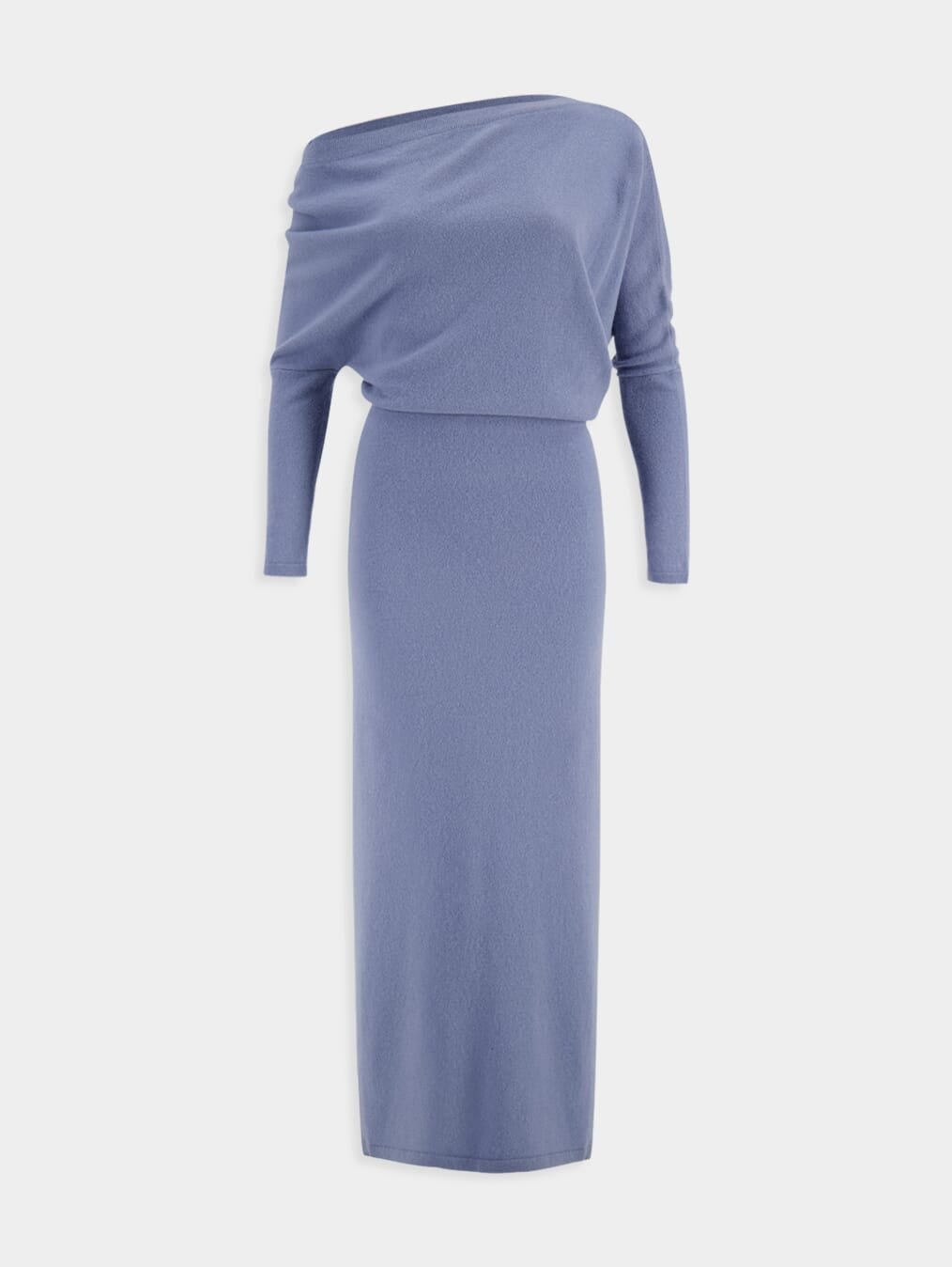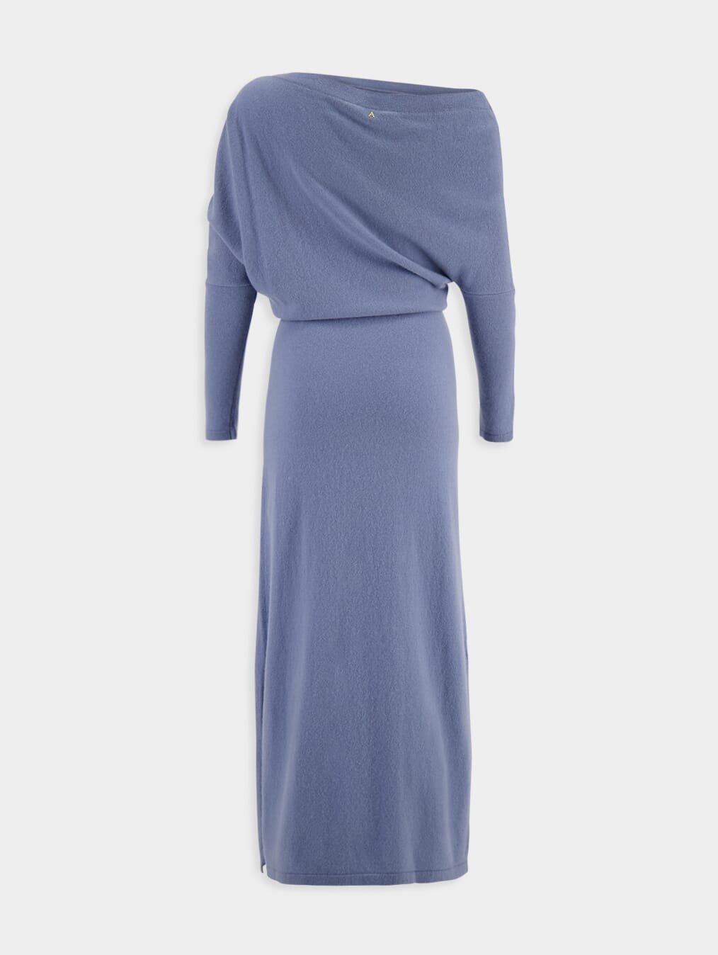 Kasos Off-Shoulder Cashmere Knit Maxi Dress, expertly knitted from tactile cashmere. This dress effortlessly combines timeless luxury with a contemporary twist, featuring an alluring off-shoulder bodice that's sure to turn heads. The long sleeves add sophistication, while the gathered dimension gracefully transitions into a split-side skirt. Crafted with precision and comfort in mind, this maxi dress is perfect for any occasion, ensuring you stand out with elegance.