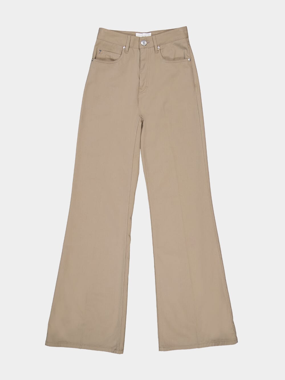 High-Waist Beige Flared Trousers, featuring a sleek design with a logo patch at the rear for a touch of sophistication. The concealed fly and button fastening provide a seamless look, complemented by classic five pockets and belt loops for added versatility. Embrace the on-trend high-waisted silhouette and flared leg, creating a flattering and stylish ensemble. Complete with a straight hem, these trousers effortlessly blend modern fashion with timeless elegance for a standout addition to your collection.