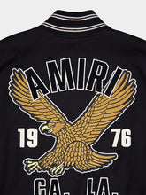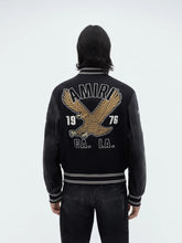 Make a bold statement with this oversized eagle varsity jacket. Embellished with striking embroidery and patches that celebrate iconic moments, this jacket combines traditional collegiate design with a touch of rebel spirit. The leather sleeves add a luxe edge, perfect for urban explorers.