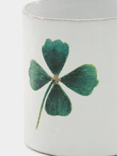 A charming blend of Parisian craftsmanship and New York artistry, the Four Leaf Clover Mug is part of a celebrated collaboration with the king of decoupage. Adorned with vibrant, tattoo-like imagery inspired by lush nature and captivating landscapes, this handmade ceramic mug brings a pop of color and personality to your daily rituals. Finished in a pristine white glaze, it is stamped with the Astier de Villatte monogram and the initials of the artisan who crafted it.