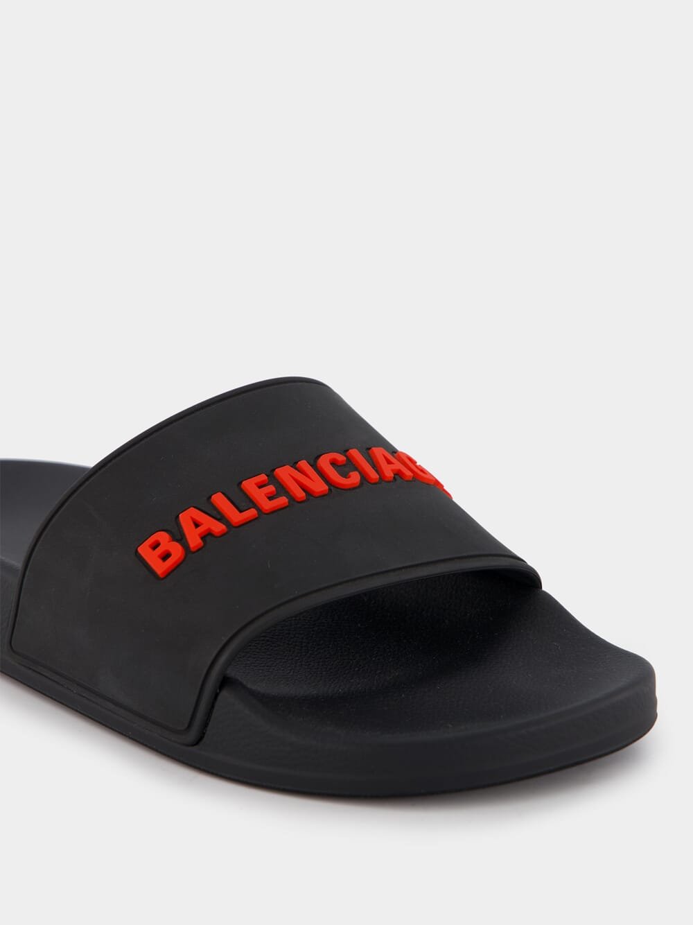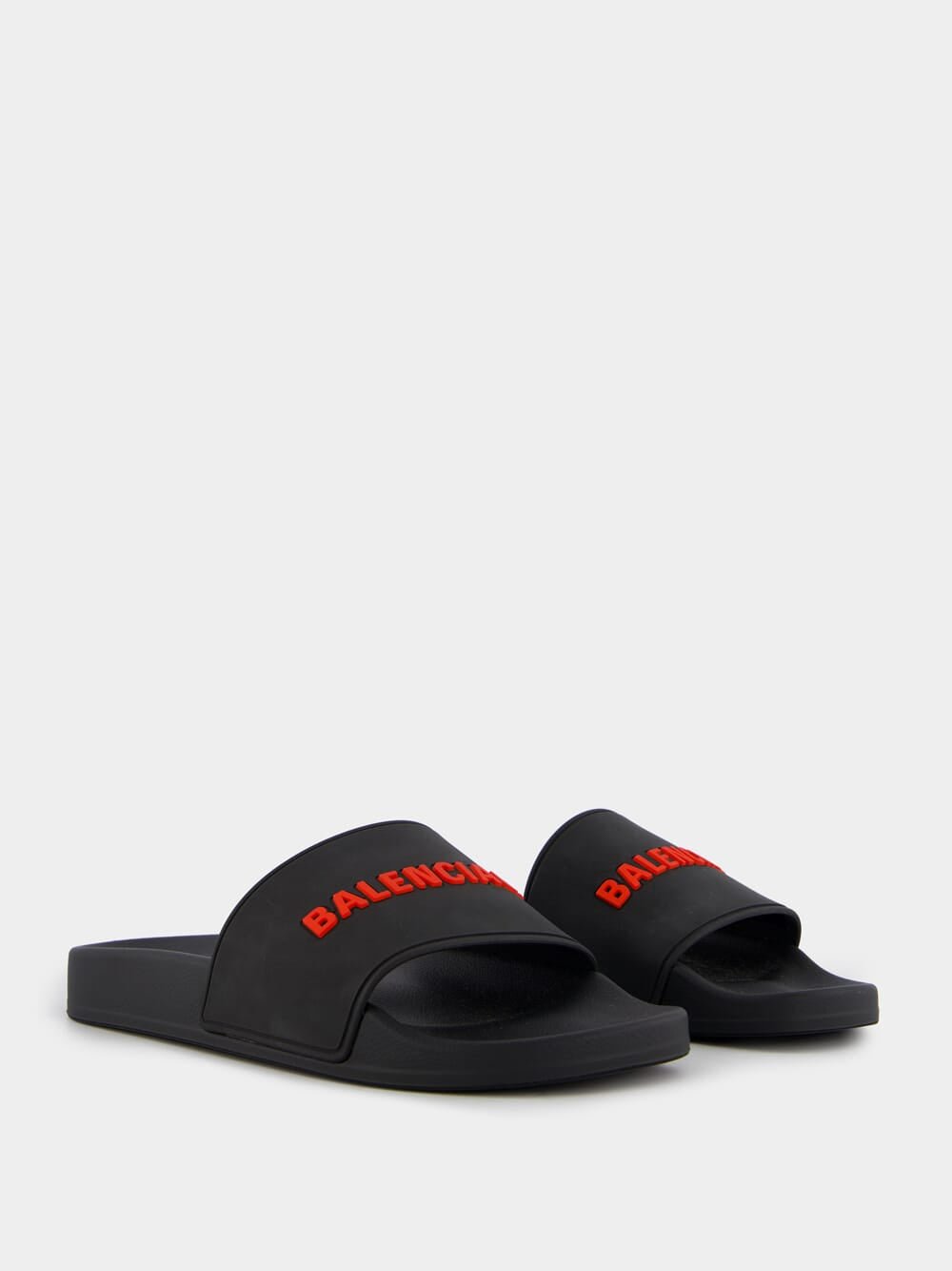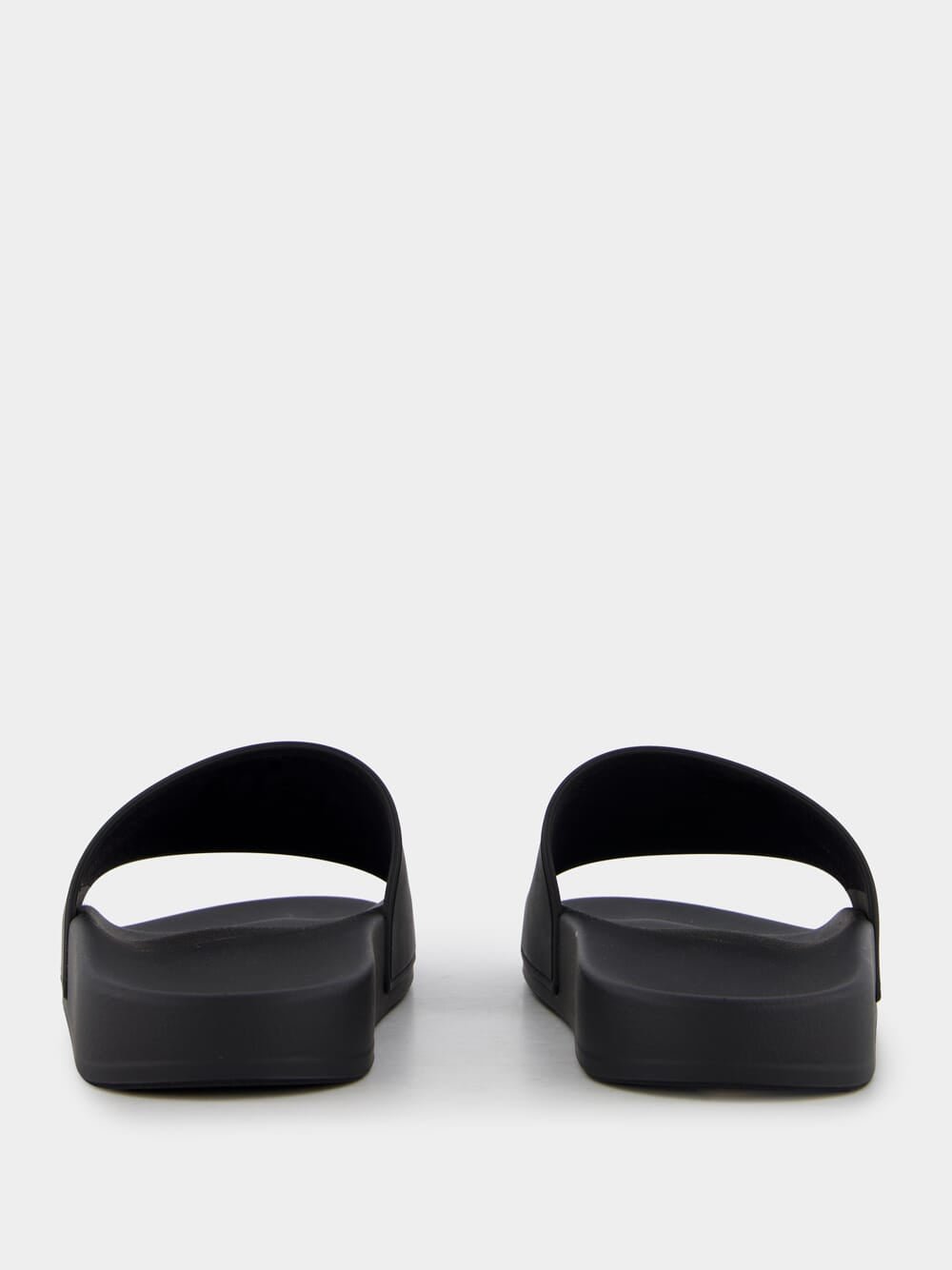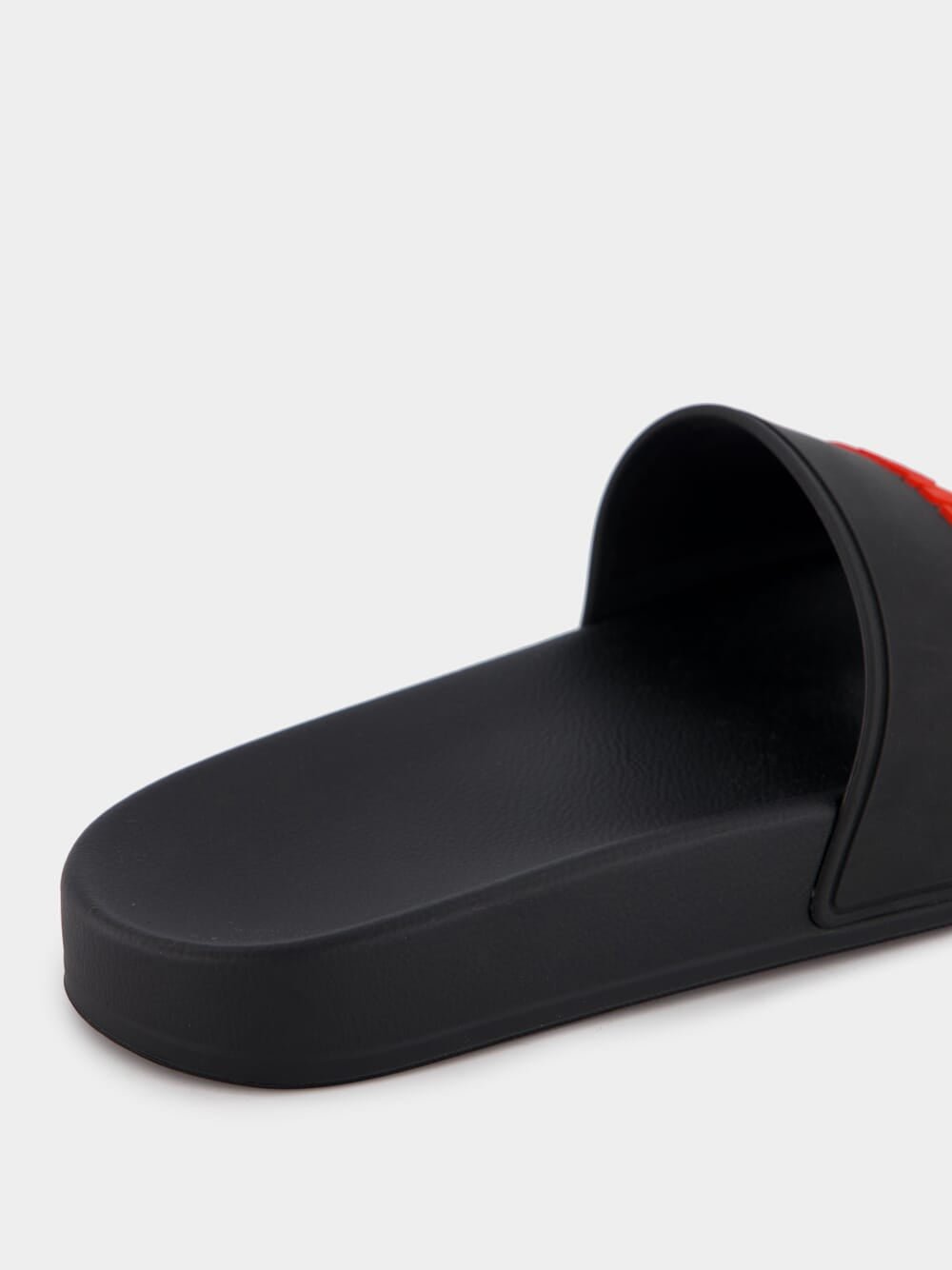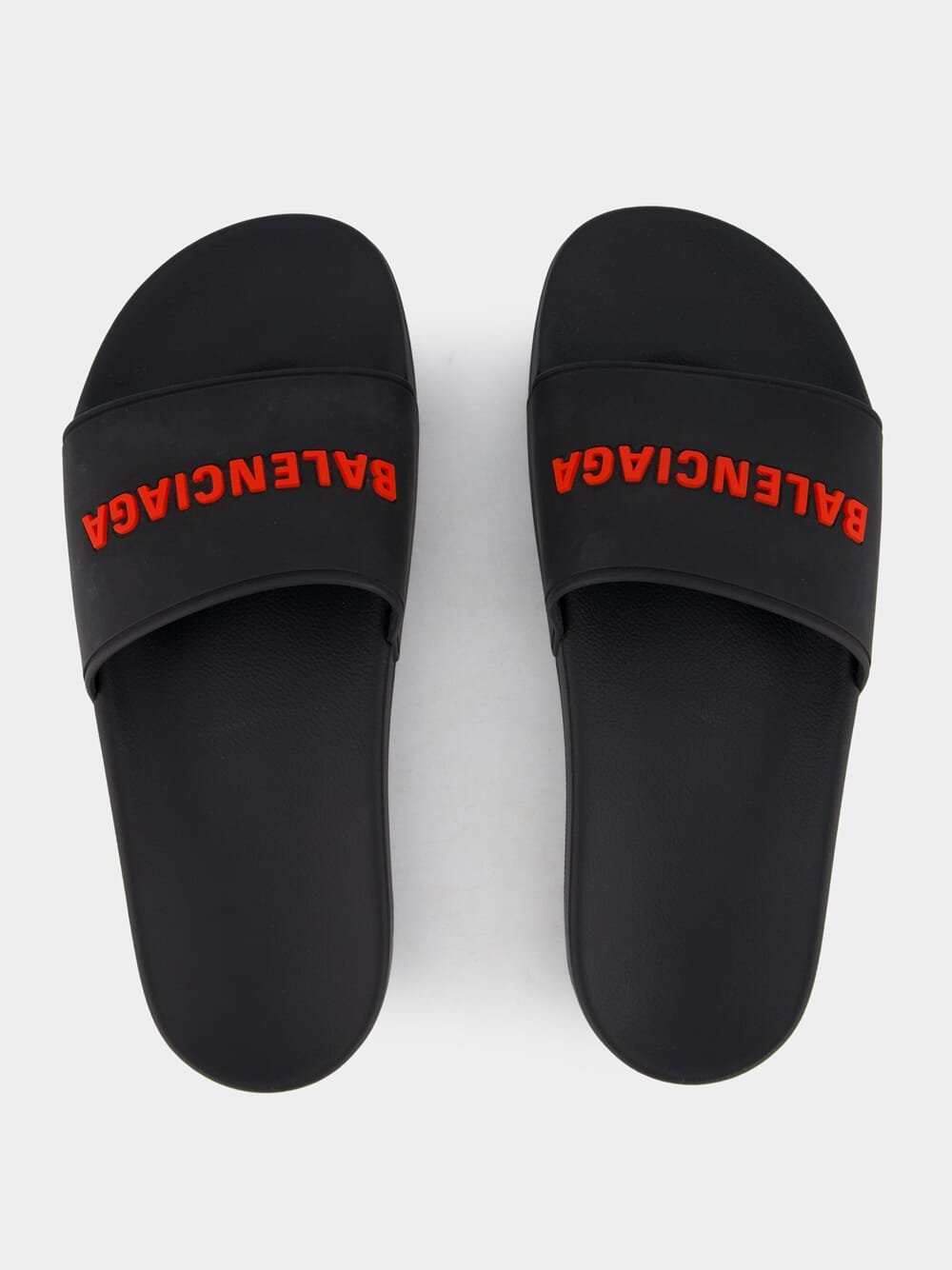 These sleek black slipper sandals feature a bold designer logo, offering a fusion of luxury and relaxation. The wide strap provides a secure fit, while the molded footbed ensures maximum comfort for all-day wear. Perfect for sophisticated poolside lounging or casual city strolls, they embody a modern approach to laid-back footwear.