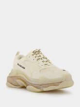 Triple S Clear-Sole Low-Top Sneakers, a leather-free option that blends style and comfort effortlessly. These sneakers feature a complex 3-layered outsole with Clear Sole technology, ensuring durability and a unique aesthetic. With embroidered size and logo details, embossed branding at the back, and a Triple S rubber logo on the tongue, these sneakers exude luxury. The washed effect adds a well-worn appearance, making these sneakers a fashion-forward choice for any occasion.