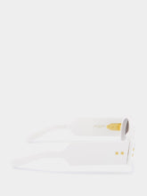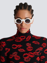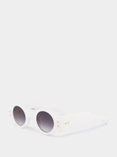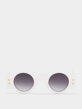 Embodying a chic aesthetic, these Olivier White Round Sunglasses feature a sleek round shape with smoke lenses. The sturdy acetate frame is accented with metal screws bearing the PB logo and wide temples adorned with a raised gold Balmain logo, ideal for fashion-forward individuals.