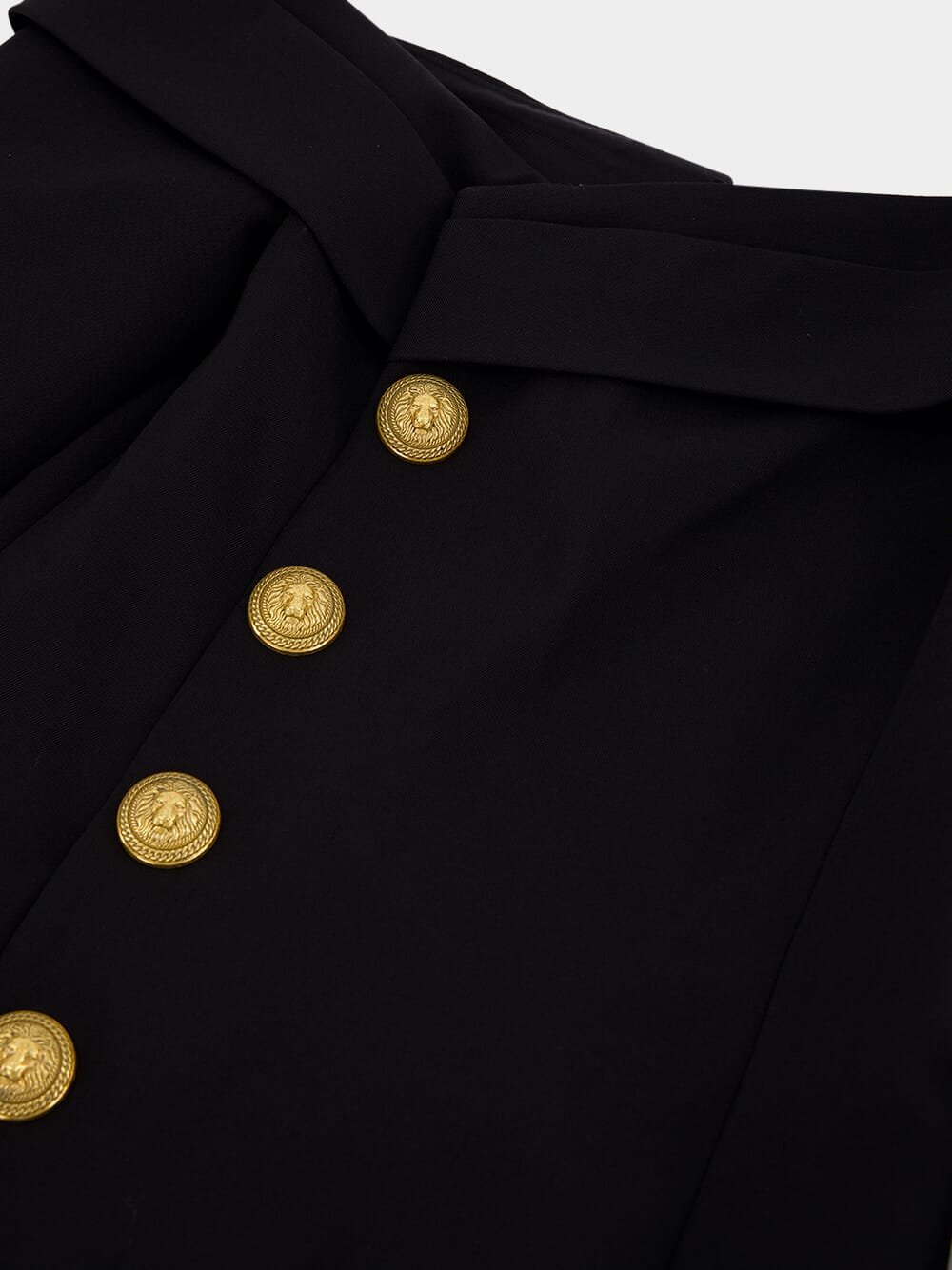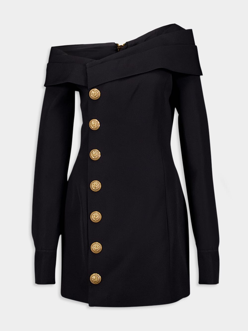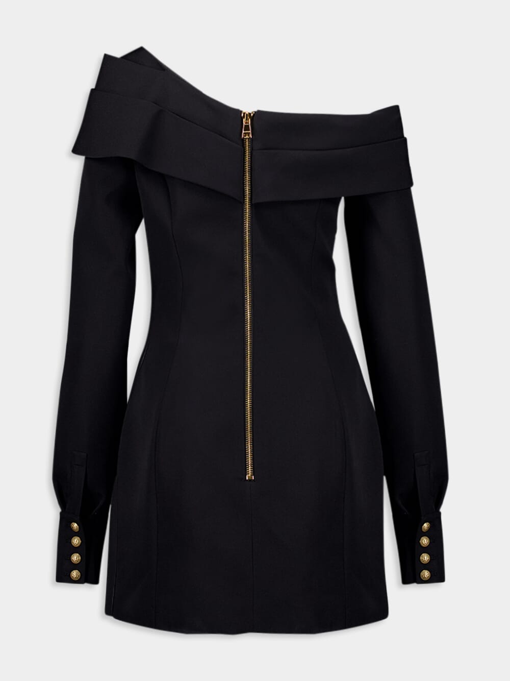 This off-shoulder dress combines elegance and edge, featuring a unique neckline and golden button details. Its form-fitting silhouette and classic black hue make it a versatile piece for evening events.