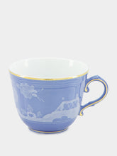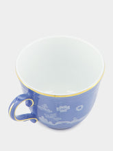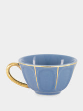 This sophisticated porcelain coffee cup with a matching saucer, graced with gold accents and a sleek blue finish, embodies a modern twist on classic elegance. Its design assures a lavish coffee experience, perfect for those serene morning rituals or an upscale afternoon tea.