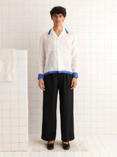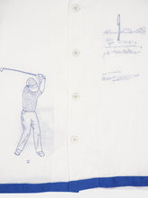 This shirt is inspired by a printed golf tablecloth from the 1980s. We reproduced motifs from the original pattern—a player, a hole, and a golf cart—for this style, embroidered in a delicate single-thread style. The shirt features appliquéd trim around the collar, hem, and cuffs.