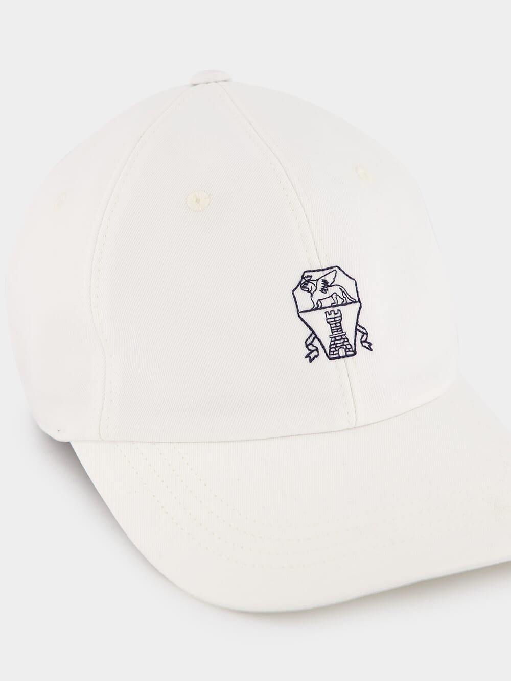 A fresh take on a casual classic, this crisp white baseball cap features an intricately embroidered emblem on the front. Its adjustable strap ensures a perfect fit, making it an essential accessory for sunny days or adding a sporty touch to any look.