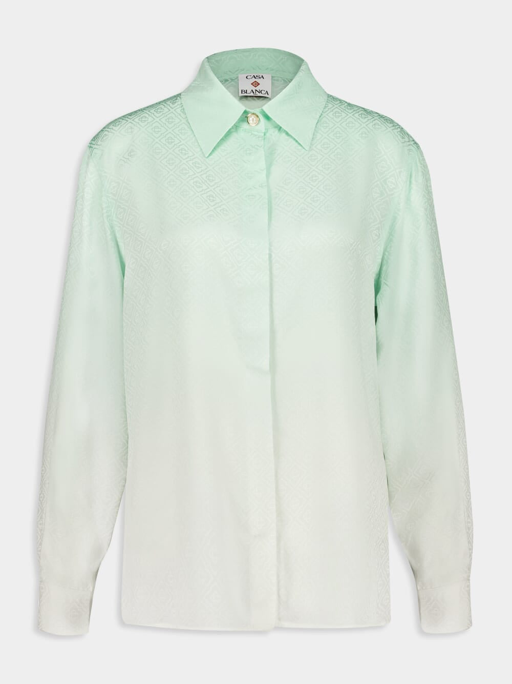 These Gradient Monogram Jacquard Trousers are expertly crafted in Italy from 100% viscose with an elegant mint-to-ivory fade. Featuring a relaxed wide-leg cut, the design includes an elasticised waistband with drawstring, in-seam side pockets, and a back patch pocket. The jacquard fabric subtly incorporates the monogram pattern, adding depth to the tone-on-tone gradient. Ideal when paired with the matching shirt for a refined, coordinated look.