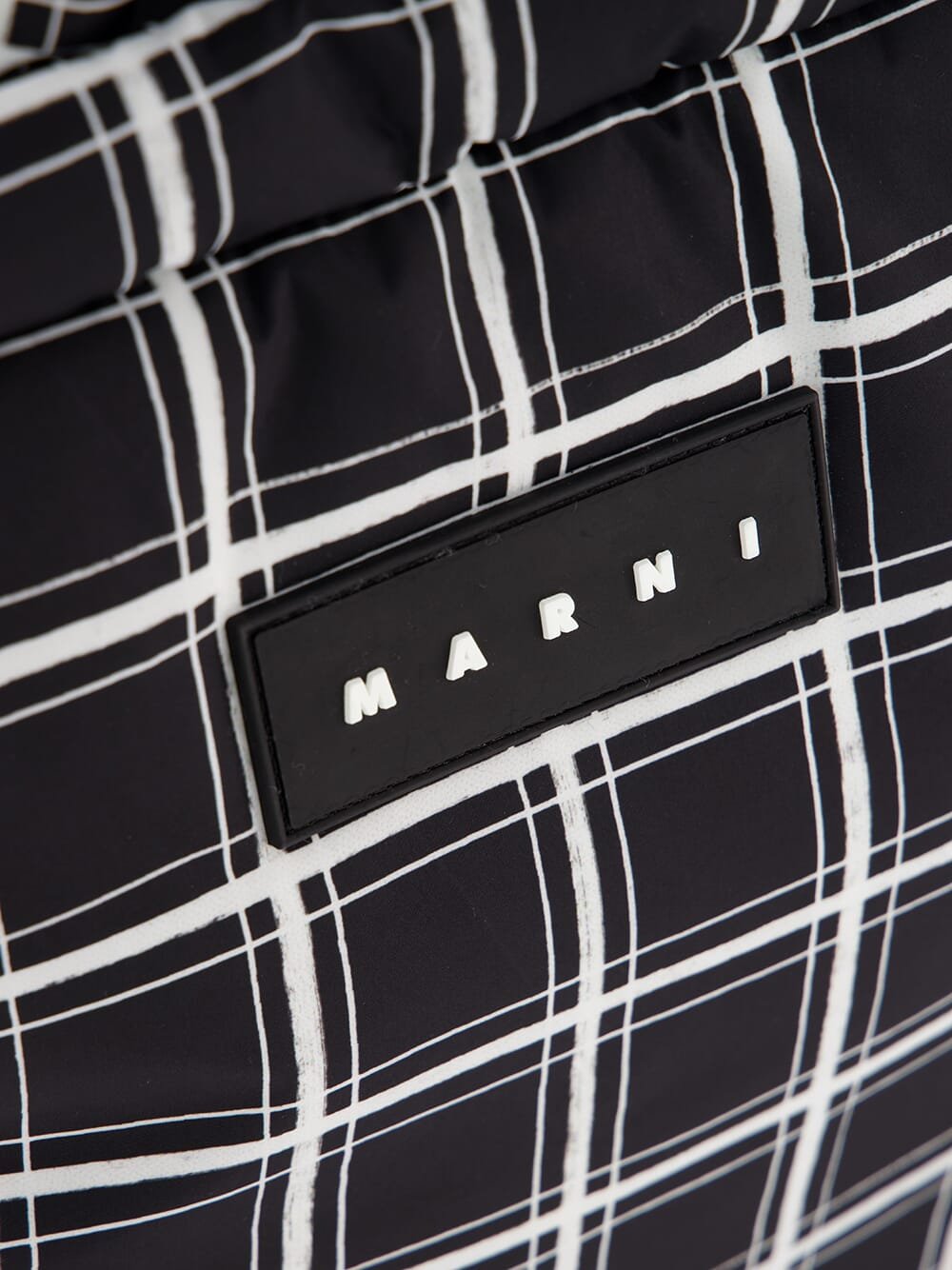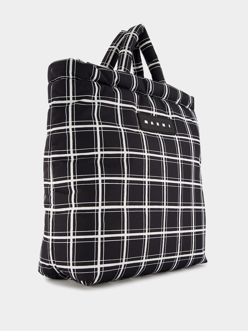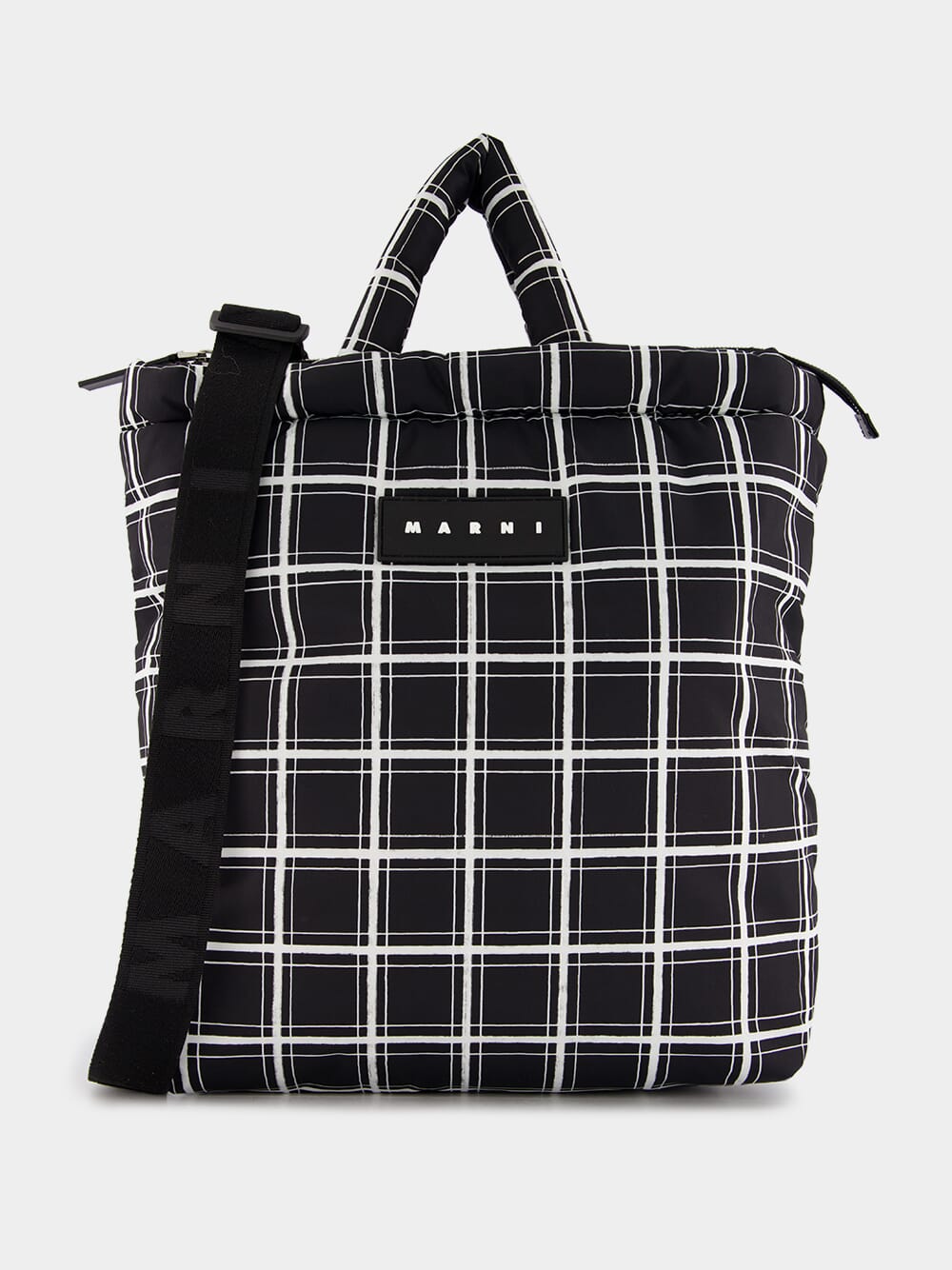 Checked Puff Tote Bag, a North/South design adorned with a chic checked print. Experience ultimate convenience with matching handles and a thoughtfully placed inside pocket. Imbued with contemporary flair, this tote is detailed with a distinctive front Marni patch, adding a touch of sophistication to your ensemble.