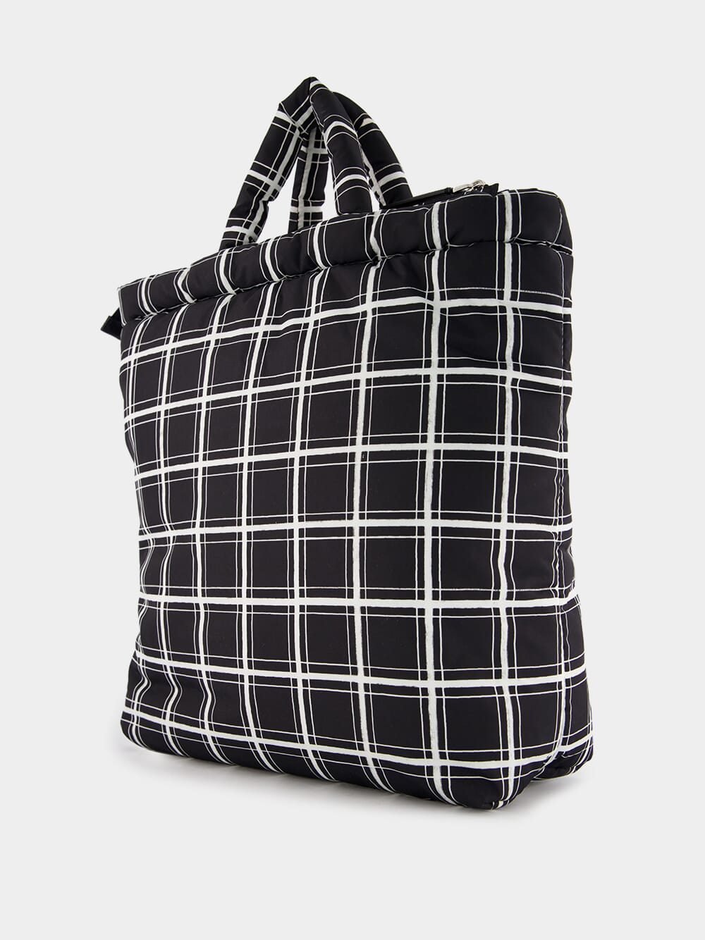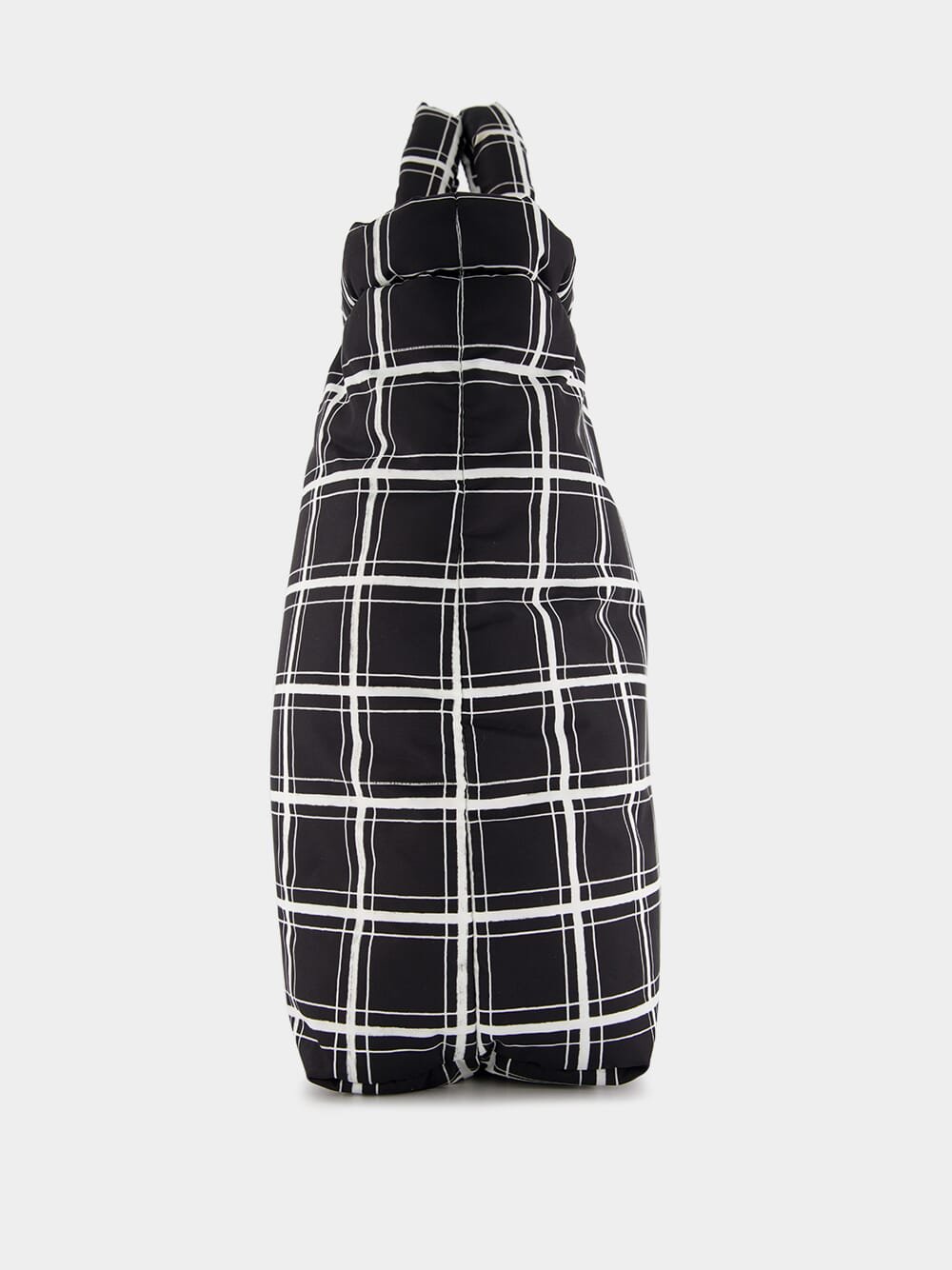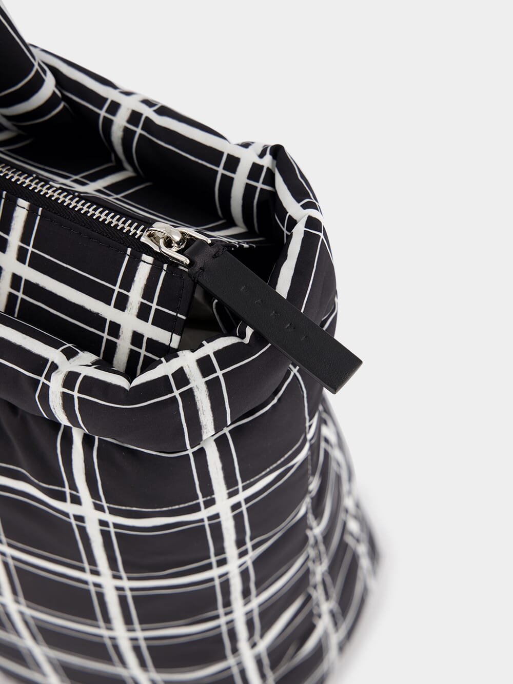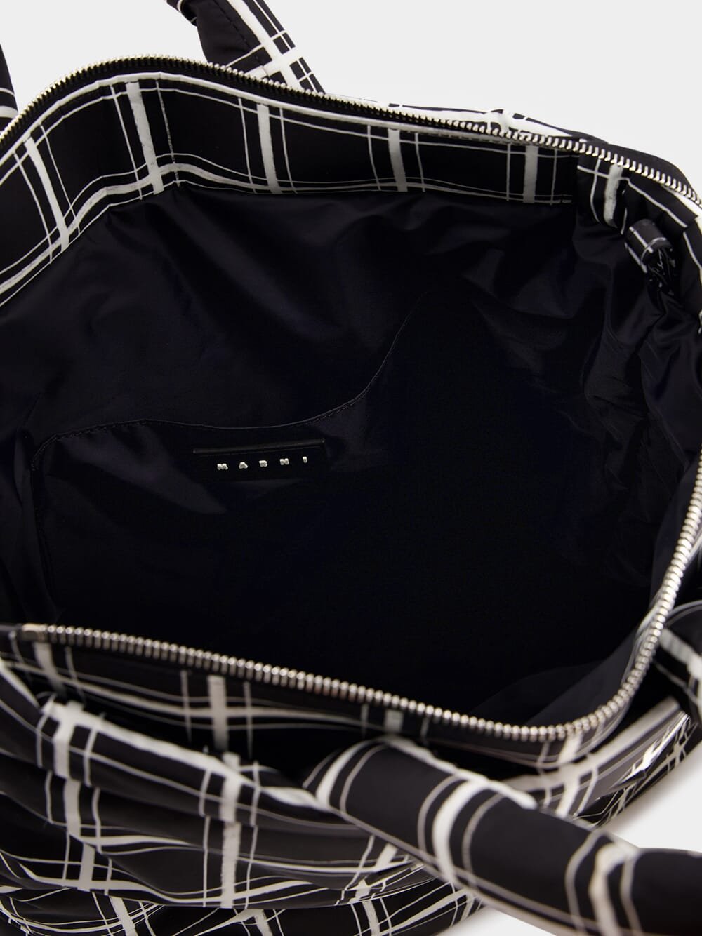 Checked Puff Tote Bag, a North/South design adorned with a chic checked print. Experience ultimate convenience with matching handles and a thoughtfully placed inside pocket. Imbued with contemporary flair, this tote is detailed with a distinctive front Marni patch, adding a touch of sophistication to your ensemble.