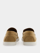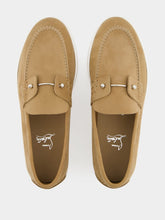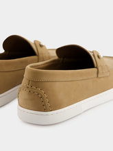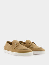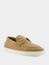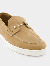 The Chambeliboat boat shoes by Christian Louboutin offer a refined take on casual footwear. Crafted from supple reversed nubuck leather in a warm Lionne beige tone, this unlined model is light and breathable—ideal for summer. The sleek silhouette is elevated by a distinctive metal collar pin on the tongue, and a white rubber sole adds a modern, urban touch to this effortlessly elegant design.