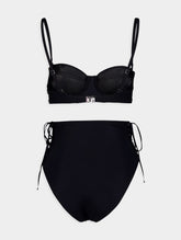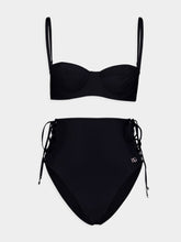 Balconette Bikini featuring a bra adorned with padded cups and underwiring for superior comfort and support. Customize your style with adjustable and detachable straps. The rear fastening showcases a branded plate in nickel-free metal for a touch of luxury. Complementing the bra, high-waisted panties with laces create a flattering silhouette, enhanced by the DG logo in nickel-free metal on the front. Plus, it comes with a matching PVC pouch for easy storage and travel.