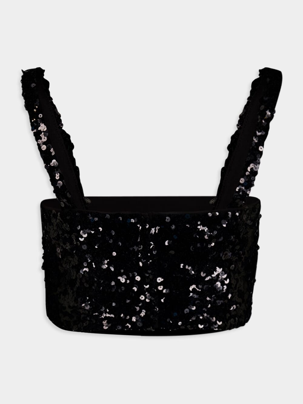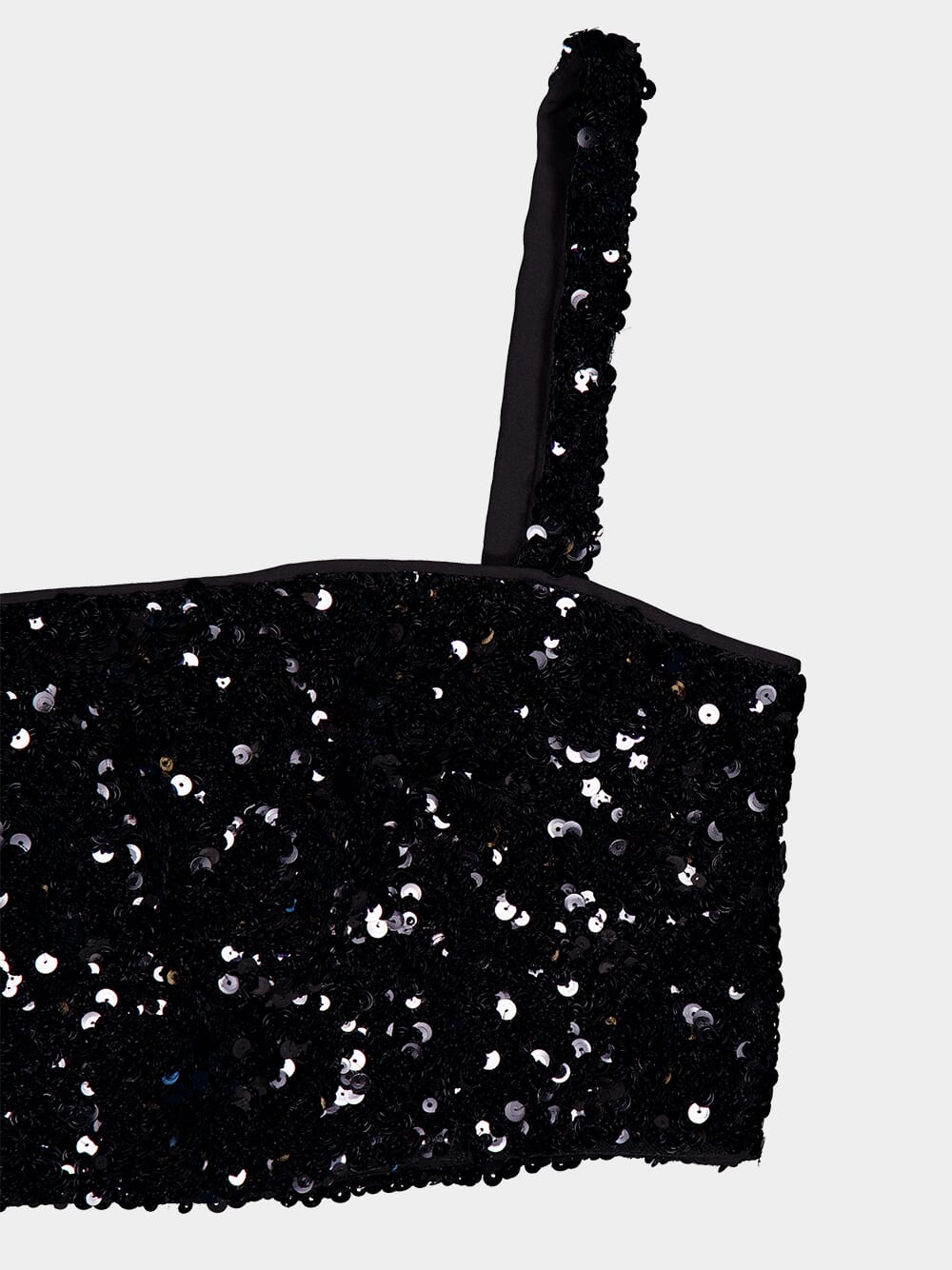 Black Sequined Crop Top With Straps, a glamorous statement piece for your wardrobe. Featuring a chic square neckline and sleeveless design with delicate shoulder straps, this top exudes elegance. The cropped fit adds a touch of trendiness, complemented by the comfort of stretch silk satin lining. Complete with a zipper fastening at the back, this dazzling piece is ready to elevate your evening look with a touch of sparkle and sophistication.