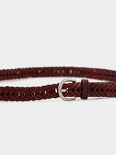 Crafted from handwoven buffalo calf leather, this slim belt by Dragon Diffusion features a refined single link weave, highlighting artisanal craftsmanship. Finished with a polished silver-tone buckle, it offers understated elegance that transitions seamlessly from casual to elevated looks. The rich bordo hue adds a timeless and versatile accent to any ensemble.