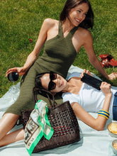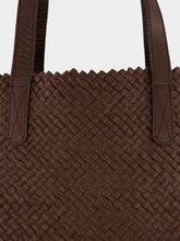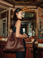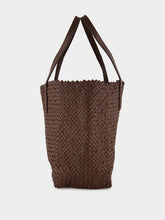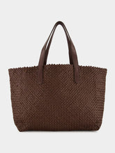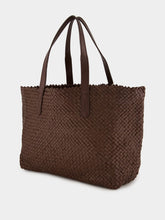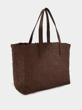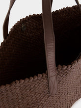 The "Inside Out Big" shoulder bag by Dragon Diffusion is a timeless accessory, meticulously handcrafted in rich brown woven leather. This spacious bag offers durability and elegance with its braided construction, sturdy leather handles, and versatile open-top design. Perfect for carrying essentials in style, it is ideal for both casual and sophisticated occasions.