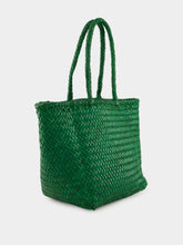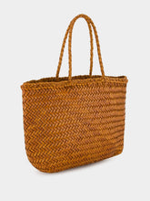 The "Grace Basket Mini" by Dragon Diffusion is a handwoven shoulder bag crafted from camel-toned buffalo calf leather. Inspired by traditional basket designs, it features a compact size ideal for carrying daily essentials. Its lightweight construction and braided handles make it a versatile choice for both casual outings and sophisticated occasions. Inside, an antiqued St. Christopher medal charm, a tribute to the patron saint of travelers, adds a unique touch of authenticity.