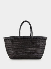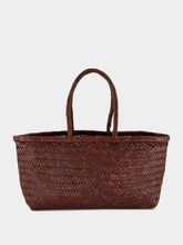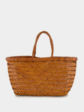 The "Inside Out Big" shoulder bag by Dragon Diffusion is a timeless accessory, handcrafted in rich camel woven leather. This spacious bag offers durability and elegance with its braided construction, sturdy leather handles, and versatile open-top design. Ideal for carrying your daily essentials in style, perfect for both casual and refined occasions.