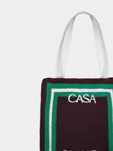 Embroidered Crochet Tote Bag, a perfect blend of style and functionality. This meticulously crafted tote features a stunning crochet knit design, with an intricately embroidered logo adorning the front. Carry with ease using the two long, durable leather top handles.