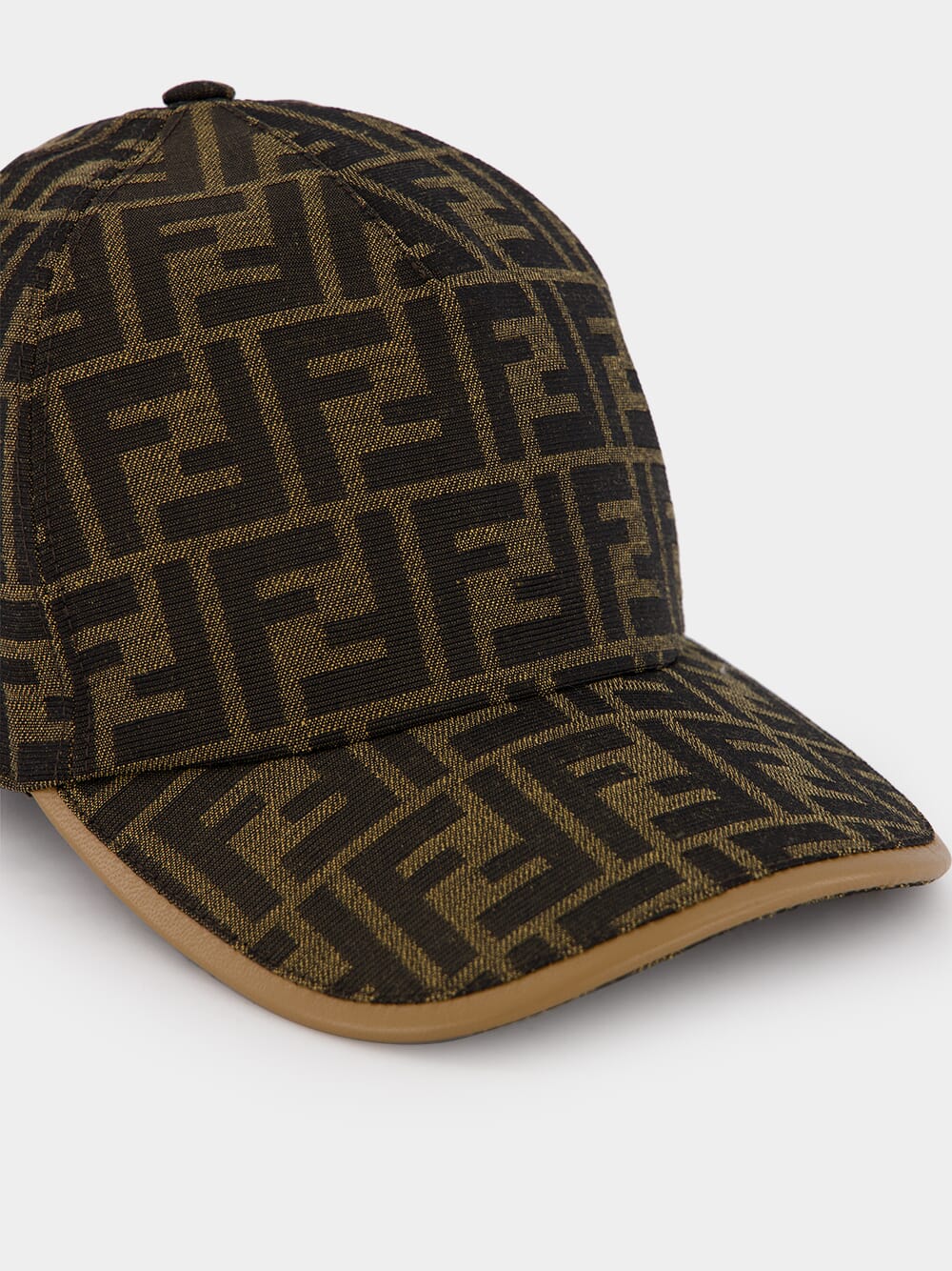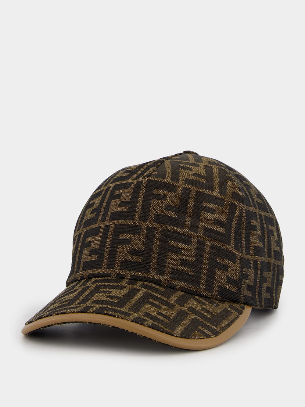This baseball cap is a contemporary classic, featuring the FF jacquard motif that adds a touch of luxury to casual wear. The cap's design is completed with a tan leather peak, combining practicality with upscale style. It's the perfect accessory for a polished off-duty look.