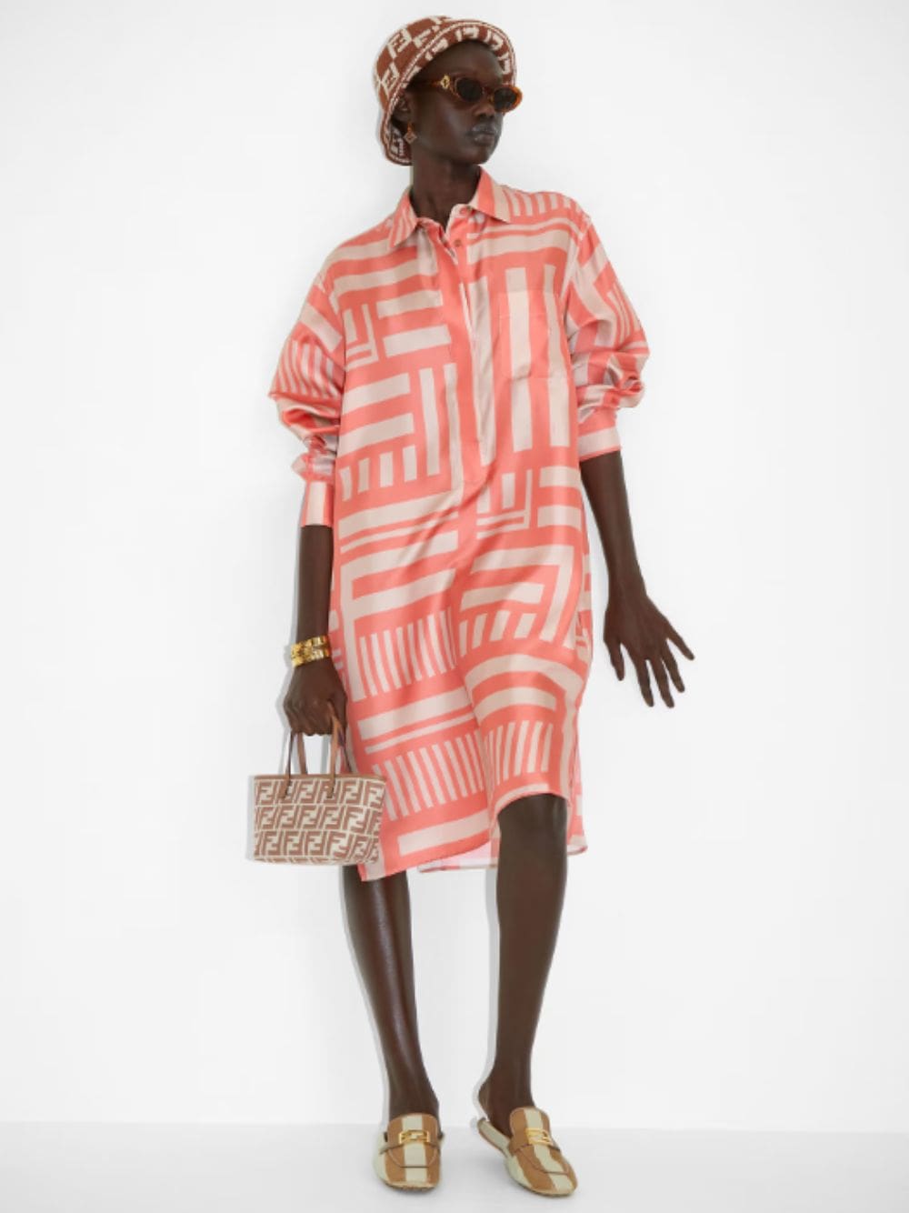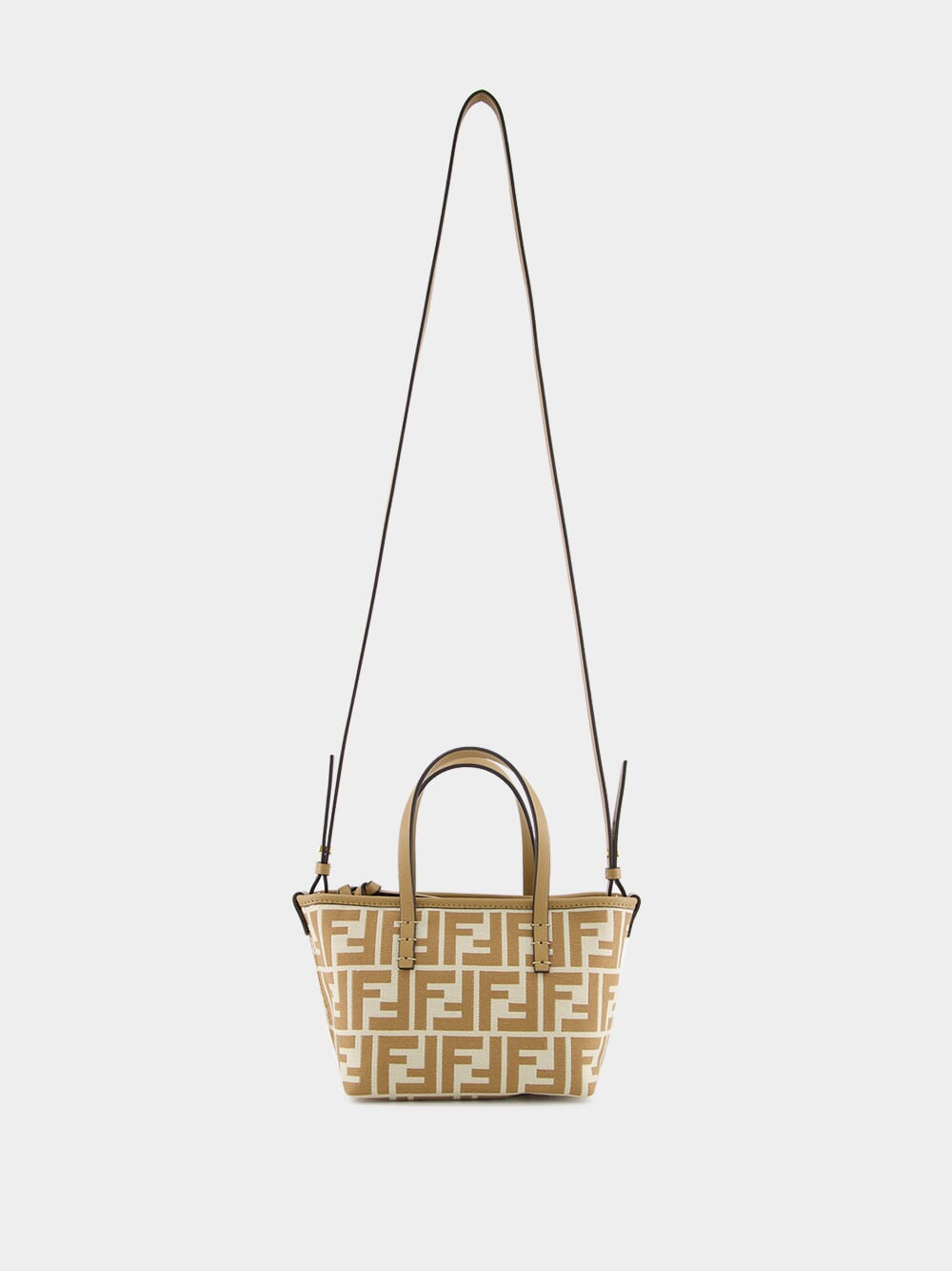 Mini shopping bag made of jacquard fabric with an iconic beige FF motif. Embellished with tone-on-tone leather and a zip fastening with a long, knotted leather zip pull. It features a Pequin striped fabric-lined internal compartment and gold-finish metalware. The bag can be worn on the shoulder or carried by hand thanks to the removable shoulder strap and beige leather handles, embellished with Selleria hand stitching.