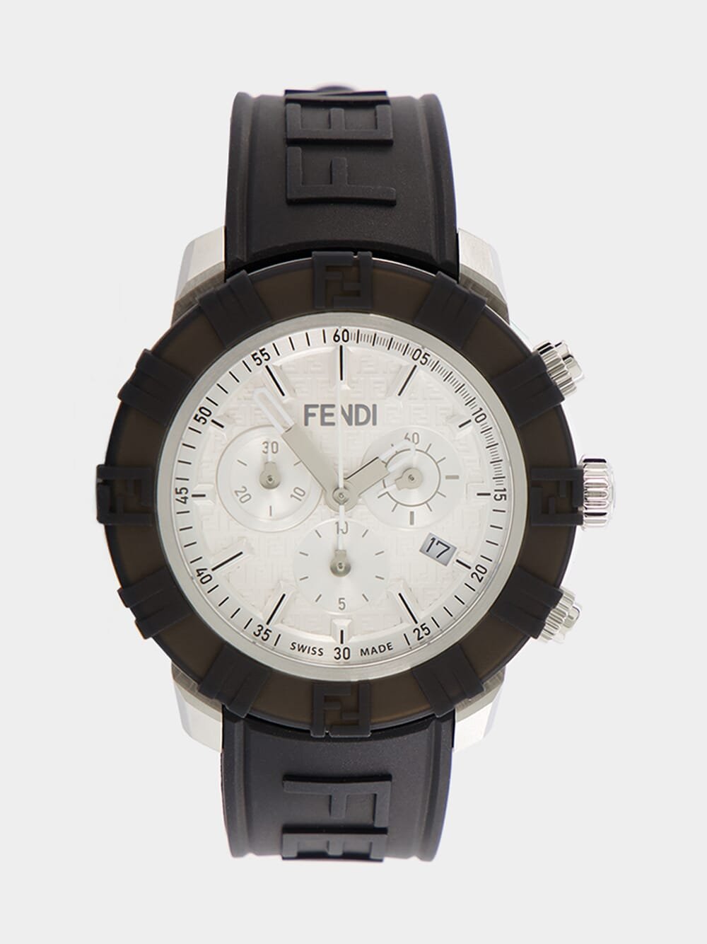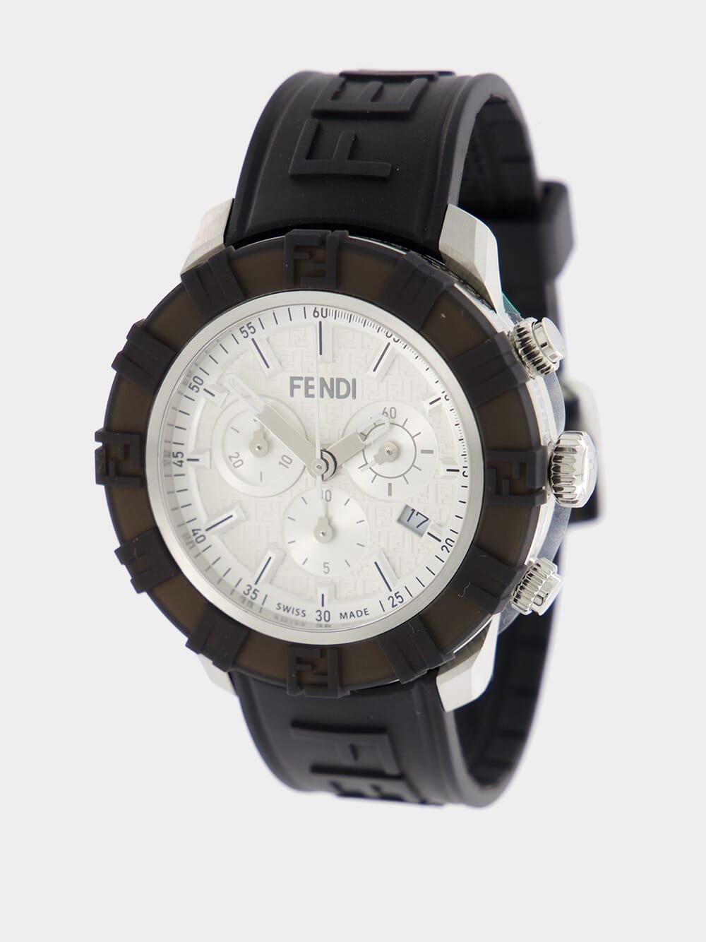 This timepiece features a round 45 mm case crafted from shiny and satin-finish grey and silver stainless steel, complemented by a stylish black silicon bezel. The plated dial showcases the iconic FF print, three sub-dials, white indices, and silver hands, exuding a touch of luxury. The black FKM rubber band, with a raised Fendi logo, adds both comfort and sophistication.