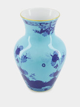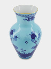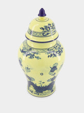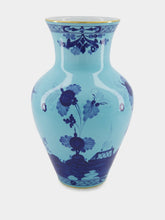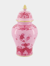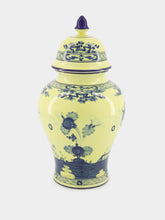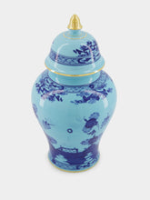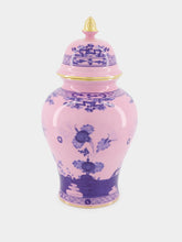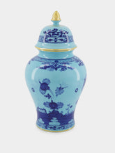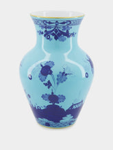 The Iris Potiche vase from the Oriente Italiano collection is an exquisite portrayal of contrast with its iris blue porcelain and blue carnation motif, edged in gold. Designed to be paired with similar shades for an elegant atmosphere, it's a piece that adds distinctive character and style in the unmistakable Ginori 1735 tradition.