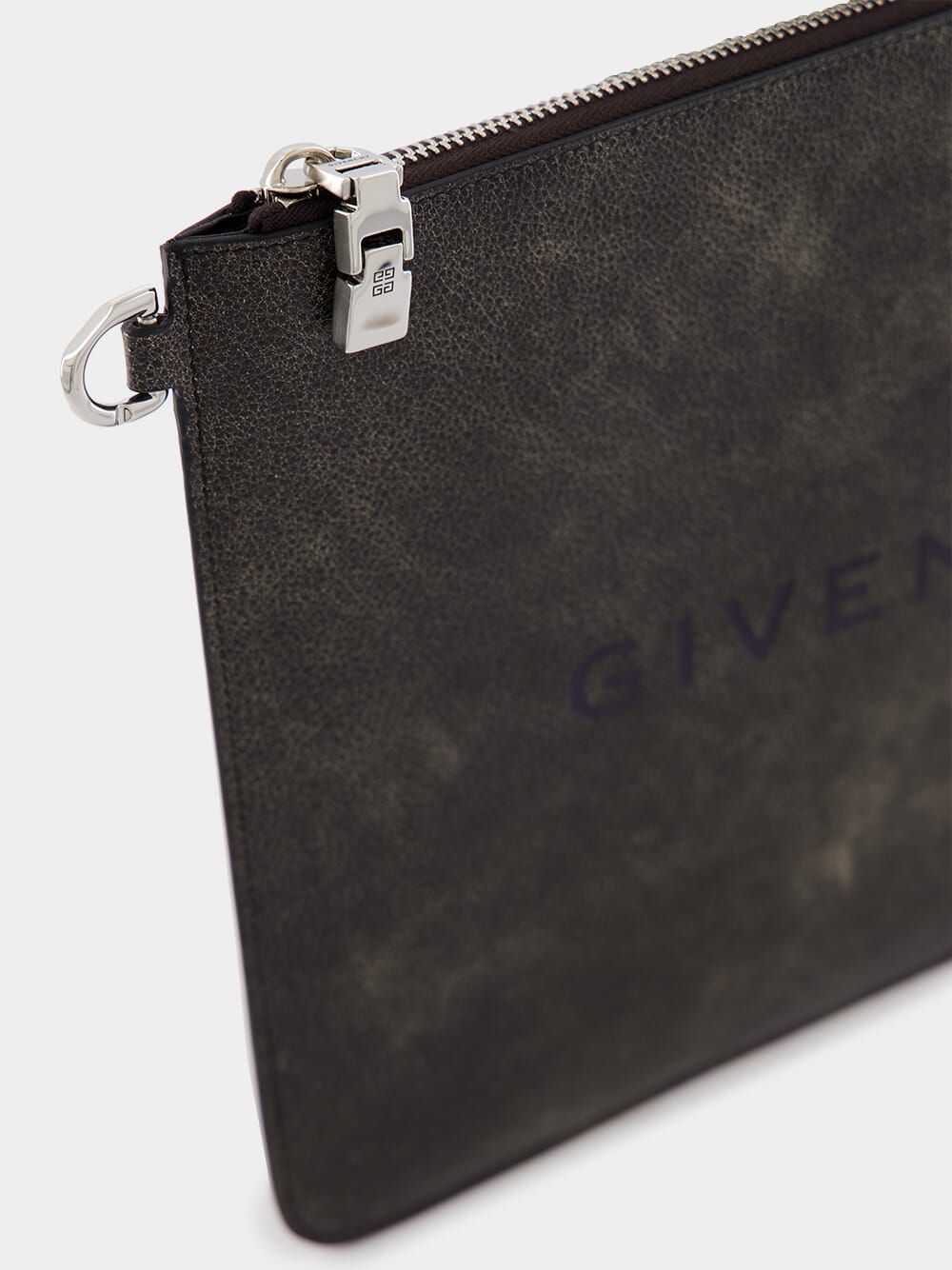 Crafted from supple black leather with a discreet logo, this sleek pouch from a renowned designer brand is a symbol of minimalist luxury. Ideal for organizing essentials, it is both practical and a statement.