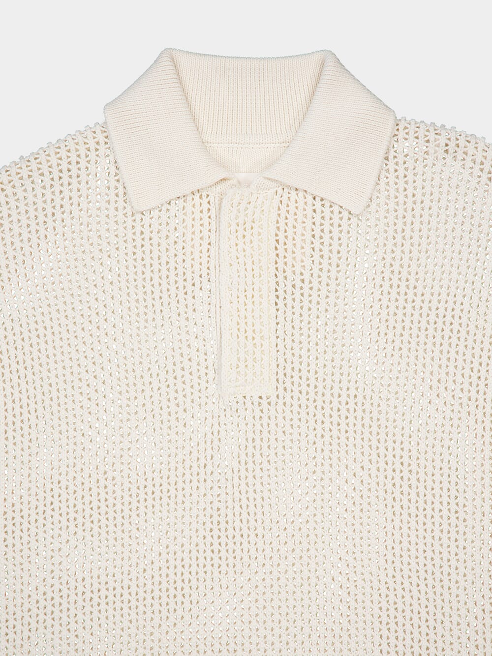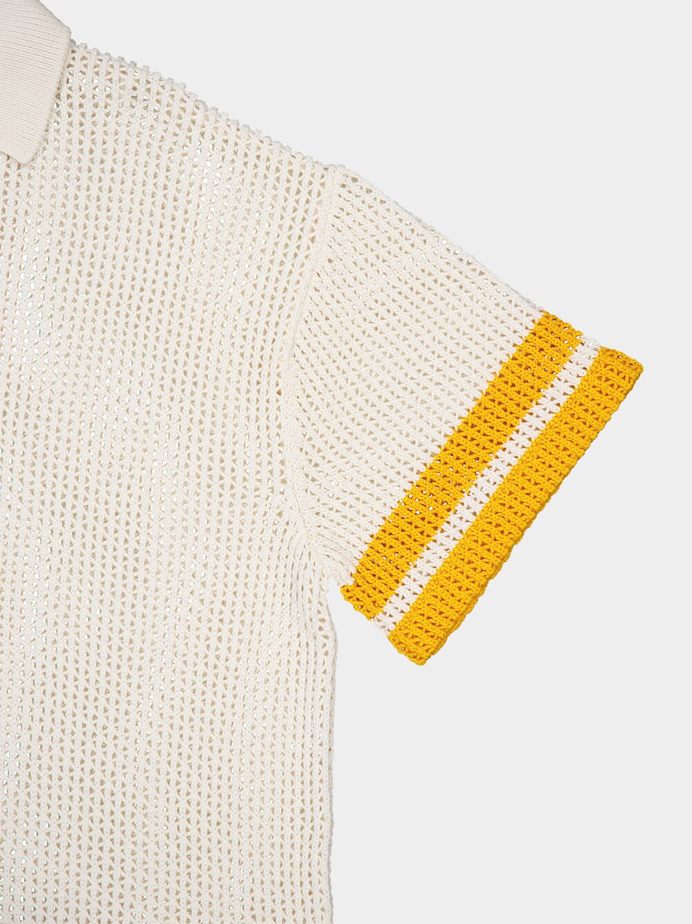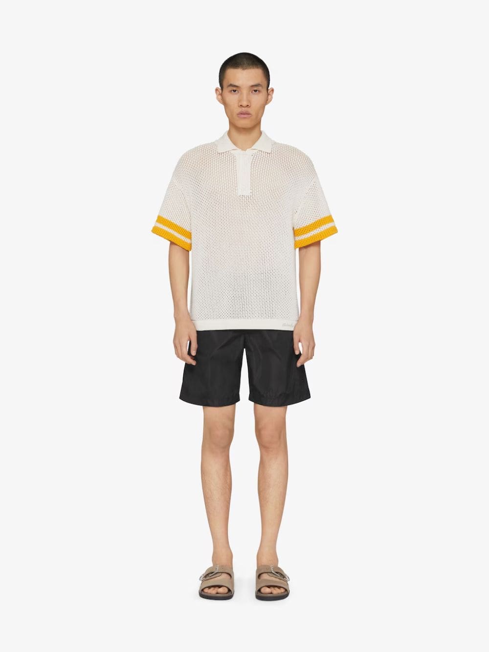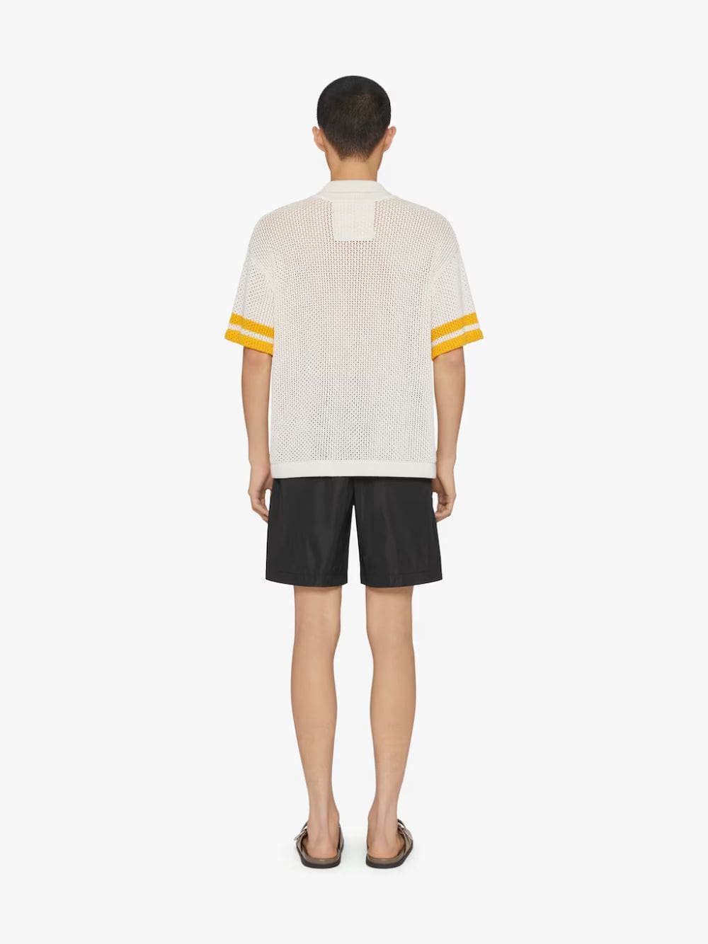 This stylish crochet polo shirt redefines casual elegance with its intricate weave and crisp, button-down collar. Embellished with subtle Givenchy embroidery at the hem and contrasting stripes on the sleeves, it's a contemporary twist on a classic.