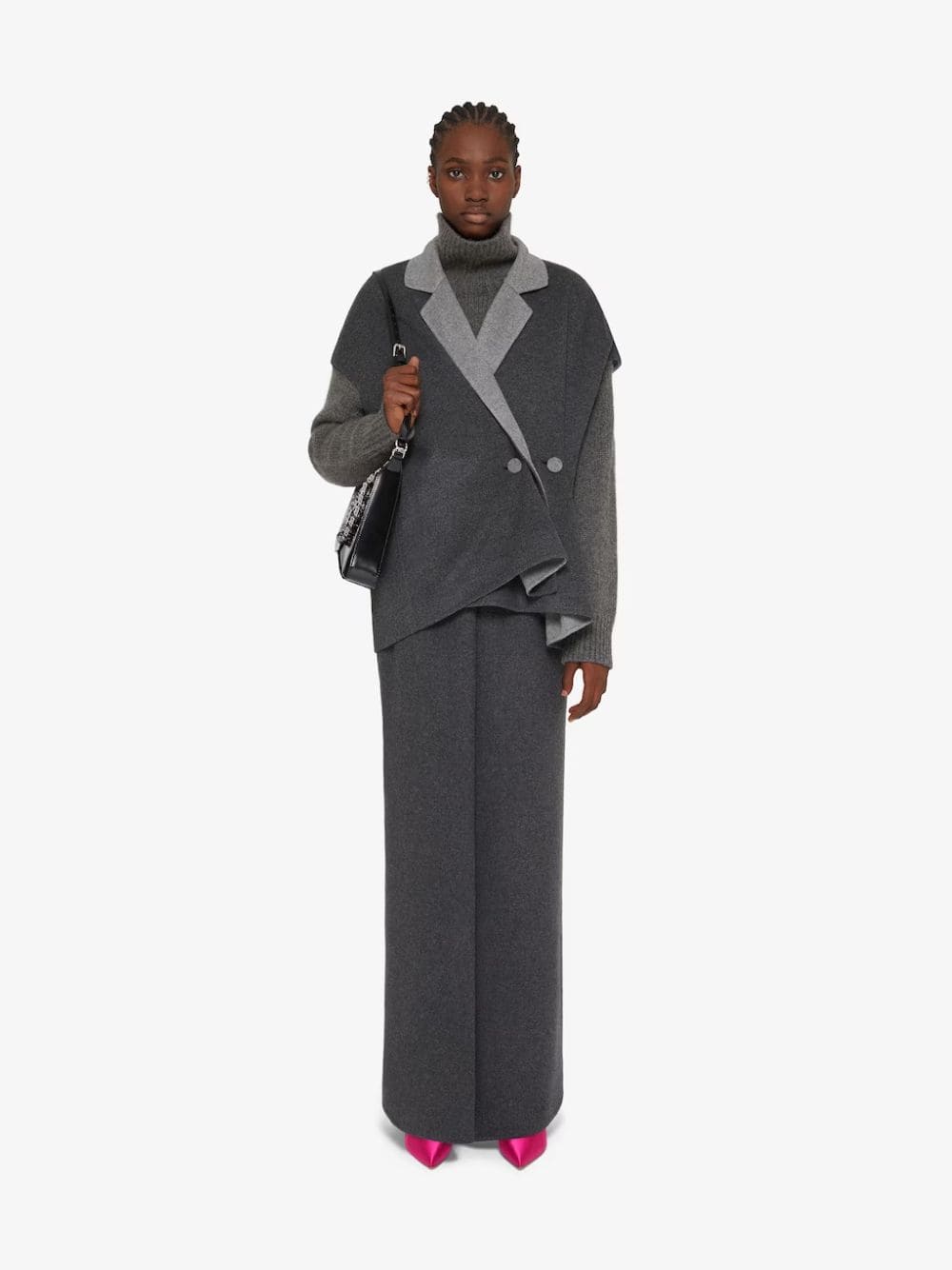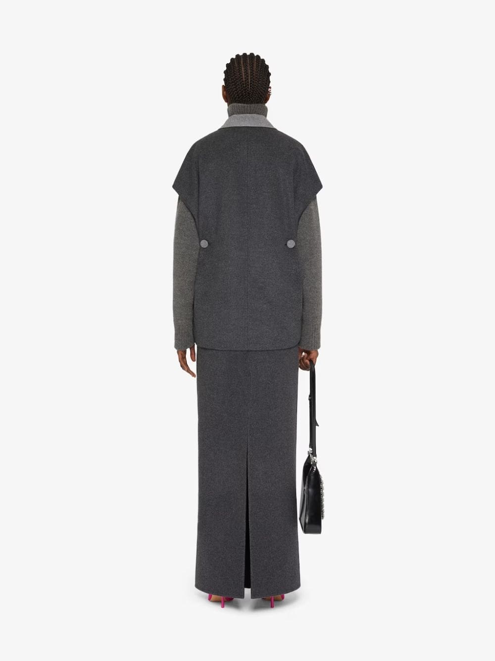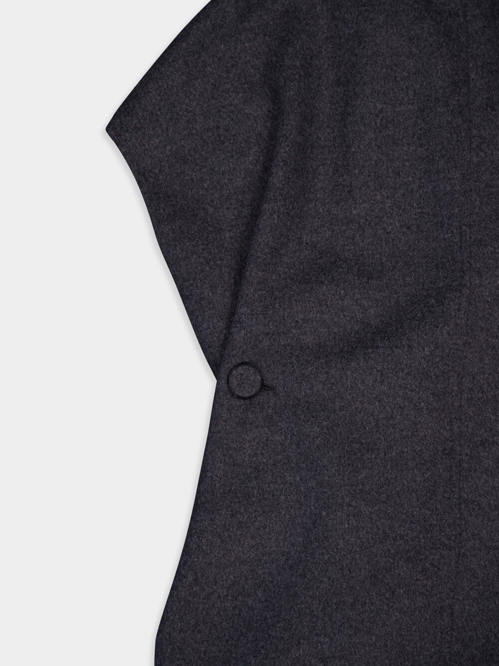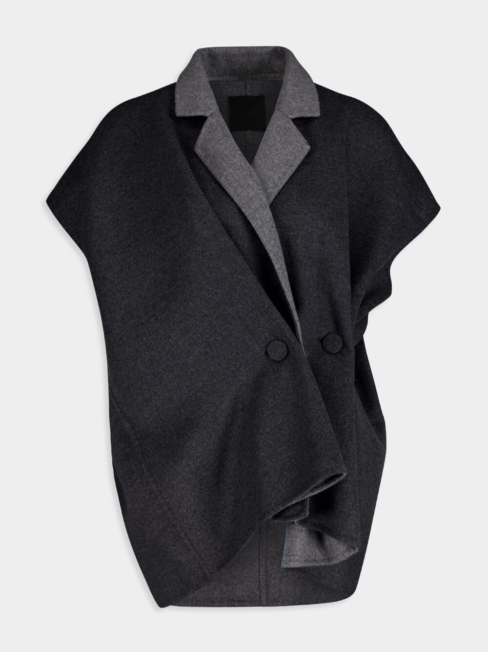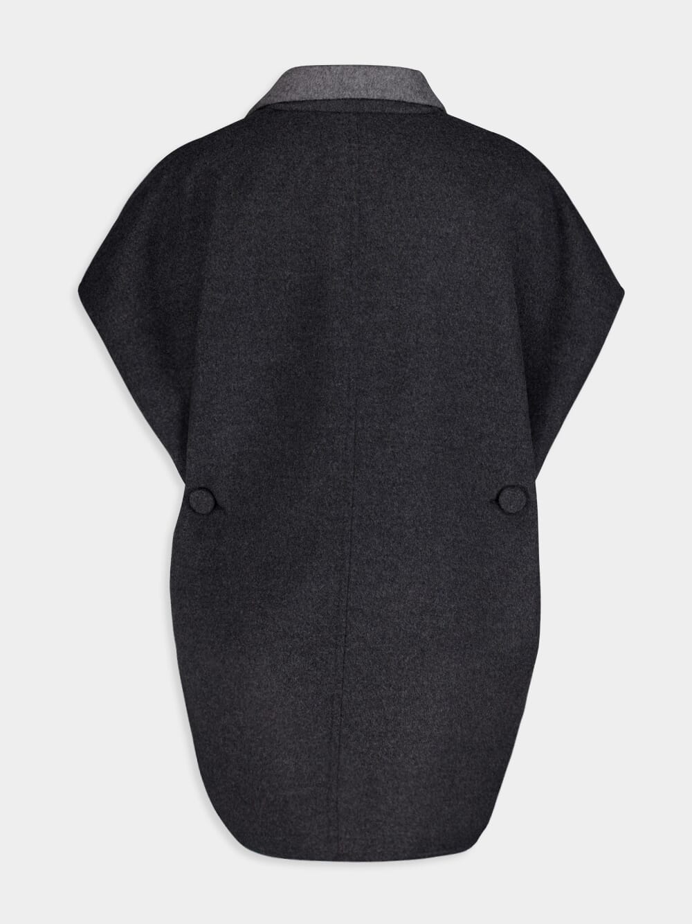 Reversible Sleeveless Jacket – a versatile blend of comfort and sophistication. Crafted from a luxurious mix of wool and cashmere, this casual jacket features a notch collar for a touch of refinement. The reversible design allows for two distinctive looks, while side buttons and a pleated effect add a playful twist. Complete with buttons at the back for waist cinching, this sleeveless jacket effortlessly combines fashion and function.